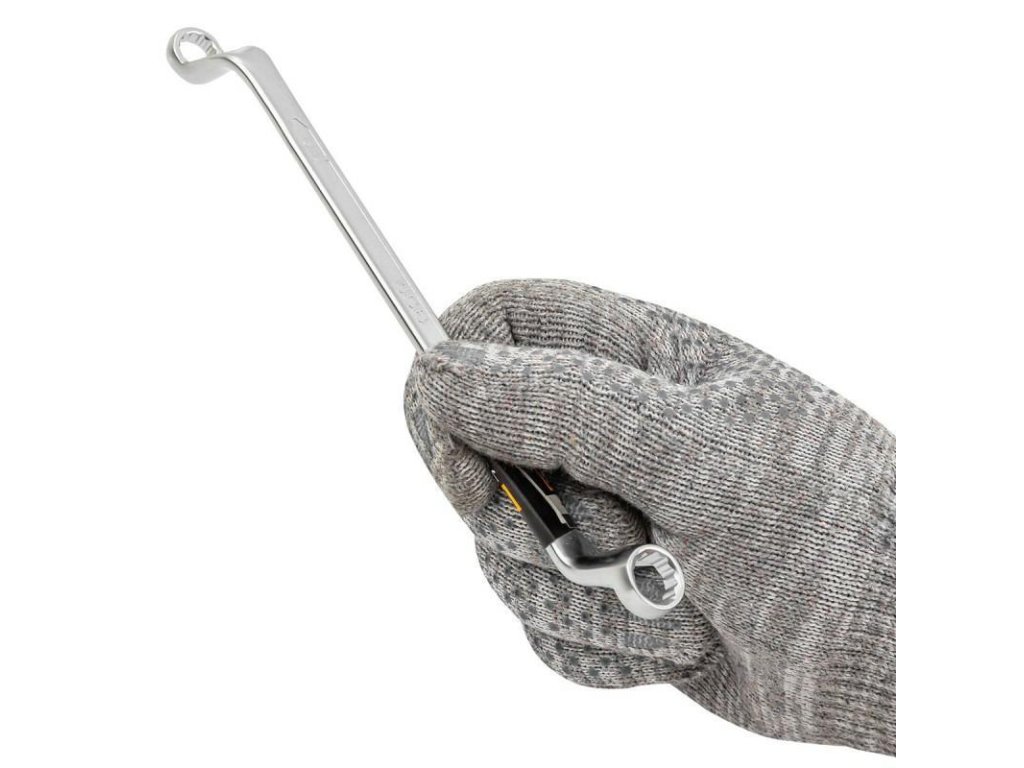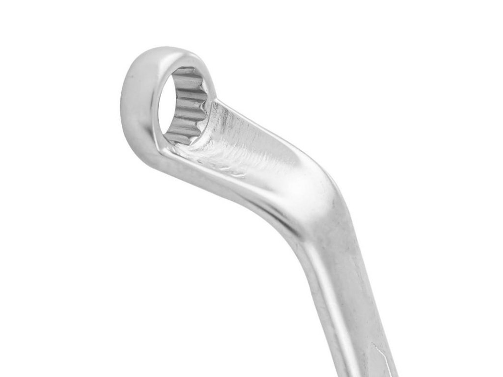 Konstrukcija z odmaknjenimi očki izboljšuje dostopnost in povečuje vzvodni učinek, kar je ključno pri sproščanju ali zategovanju močno obremenjenih vijakov. Zaradi proizvodnje iz krom-vanadijevega jekla (CrV) z metodo hladnega tlačenja je orodje izjemno trpežno, odporen proti deformacijam in obrabi.