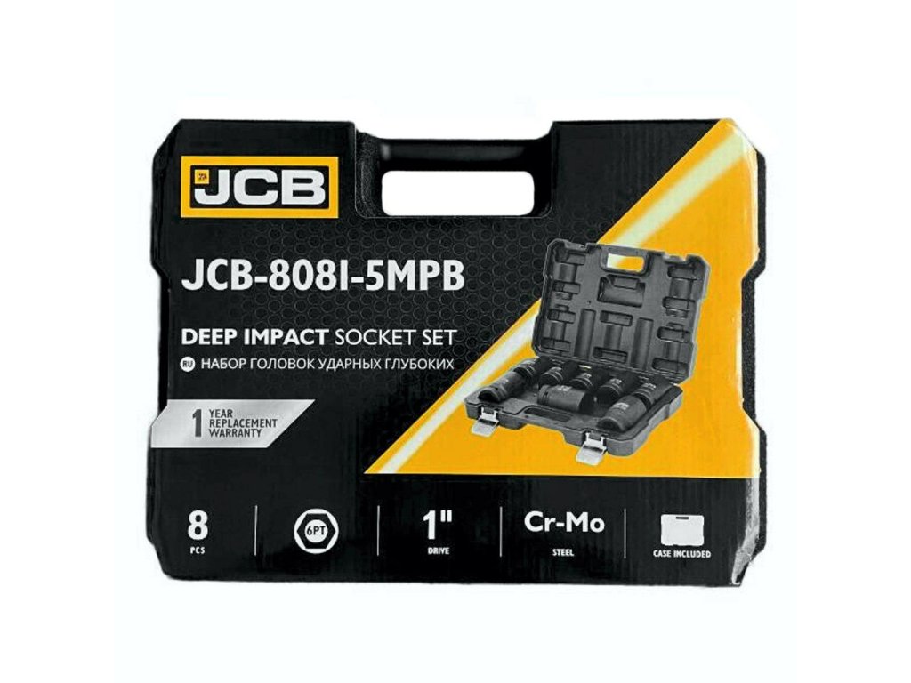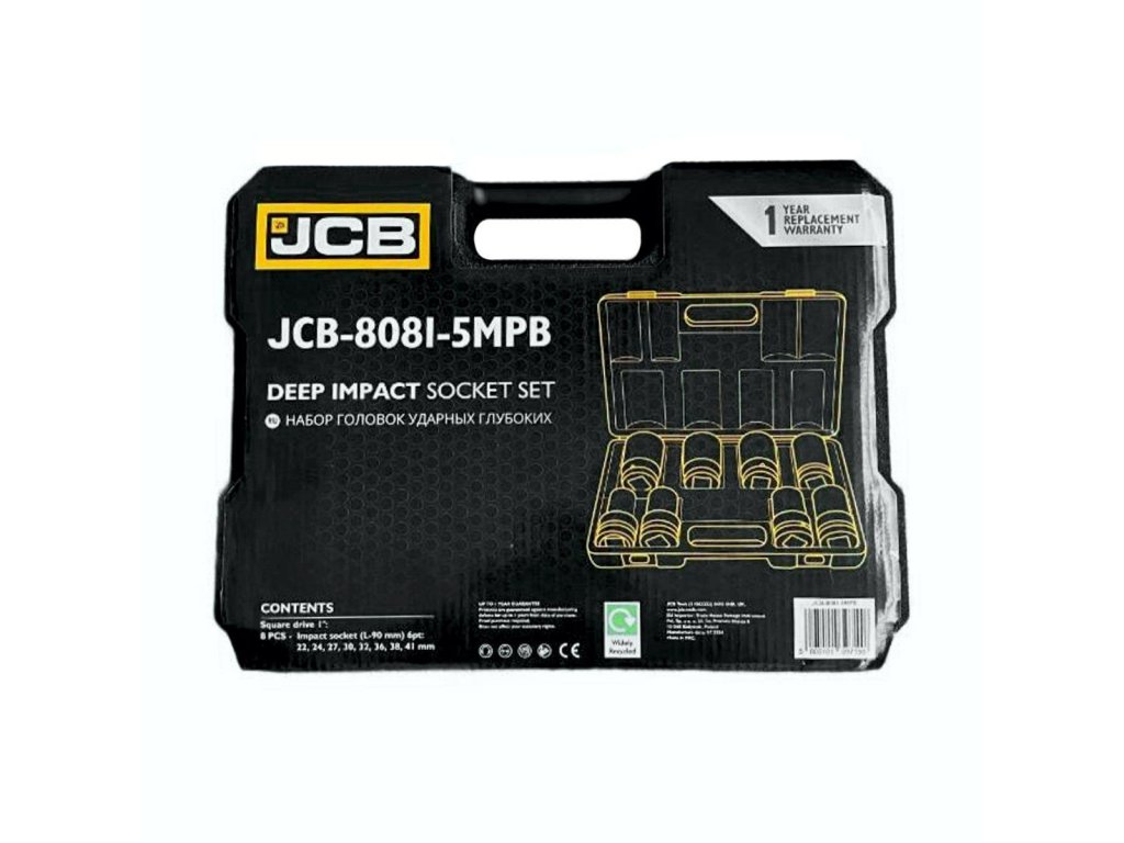 Komplet 8 globokih udarnih glav JCB Orodja je profesionalno orodje namenjeno intenzivnemu delu v delavnici, vključno z montažo in demontažo vijakov in matic s pomočjo udarnih ključev.
