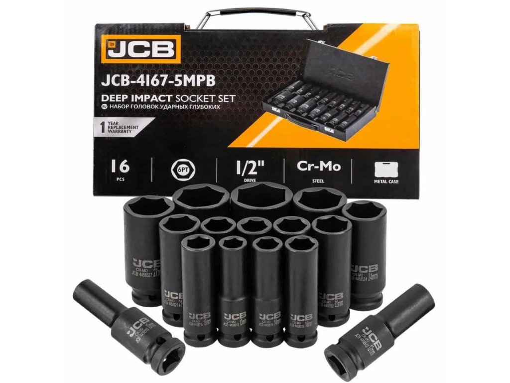 Set 16 globokih udarnih nastavkov JCB Tools JCB-4167-5MPB je profesionalno orodje namenjeno intenzivnim delovnim nalogam, vključno z montažo in demontažo vijakov in matic s pomočjo udarnih ključev.
