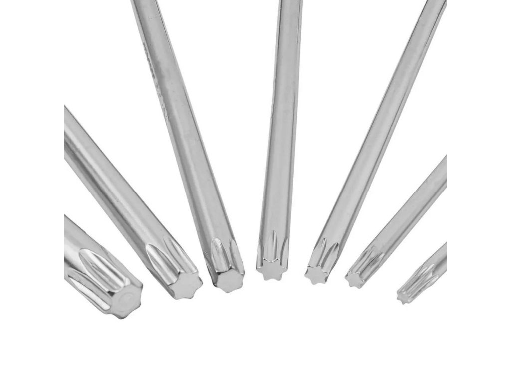 Sata ekstra dolgih TORX ključev v obliki črke L je visokokakovostna orodjarna, namenjena natančnemu privijanju in odvijanju vijakov s utorom tipa TORX (zvezda). Zaradi podaljšane zasnove vsak instrument omogoča lahkoten dostop do težko dostopnih mest in klasična oblika črke L omogoča udobno uporabo tako z krajšim kot daljšim ročajem.
