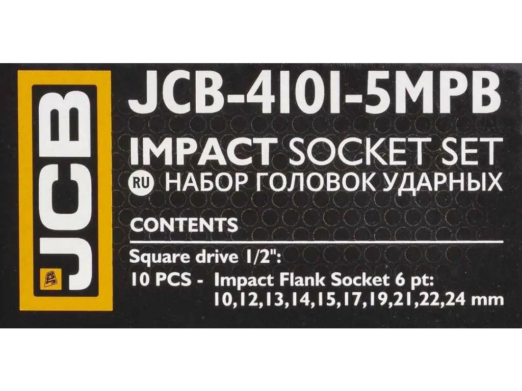JCB-4159-5MPB je popoln set 10 udarnih nastavkov namenjenih za najzahtevnejša opravila v delavnicah, avtomehaničnih delavnicah in med montažnimi deli. Izdelani so iz visoko odpornega jekla Cr-Mo (krom-molibdenovega), nastavki ponujajo izjemno odpornost proti razpokanju, udarcem in deformacijam, tudi med delom z pnevmatskimi ali električnimi ključi.