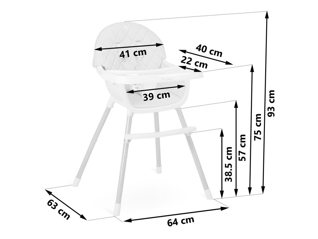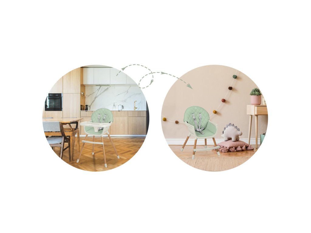 Stol omogoča prosto nastavitev razdalje pladnja od otroka. Lahko se tudi kadarkoli popolnoma razstavi.