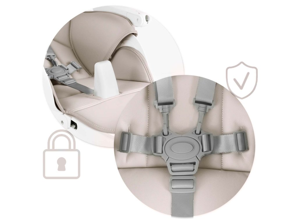 - Dodatna zaščita, ki preprečuje nenadzorovan zdrs otroka iz stola. Lahko se popolnoma odstranijo, ko niso več potrebni.