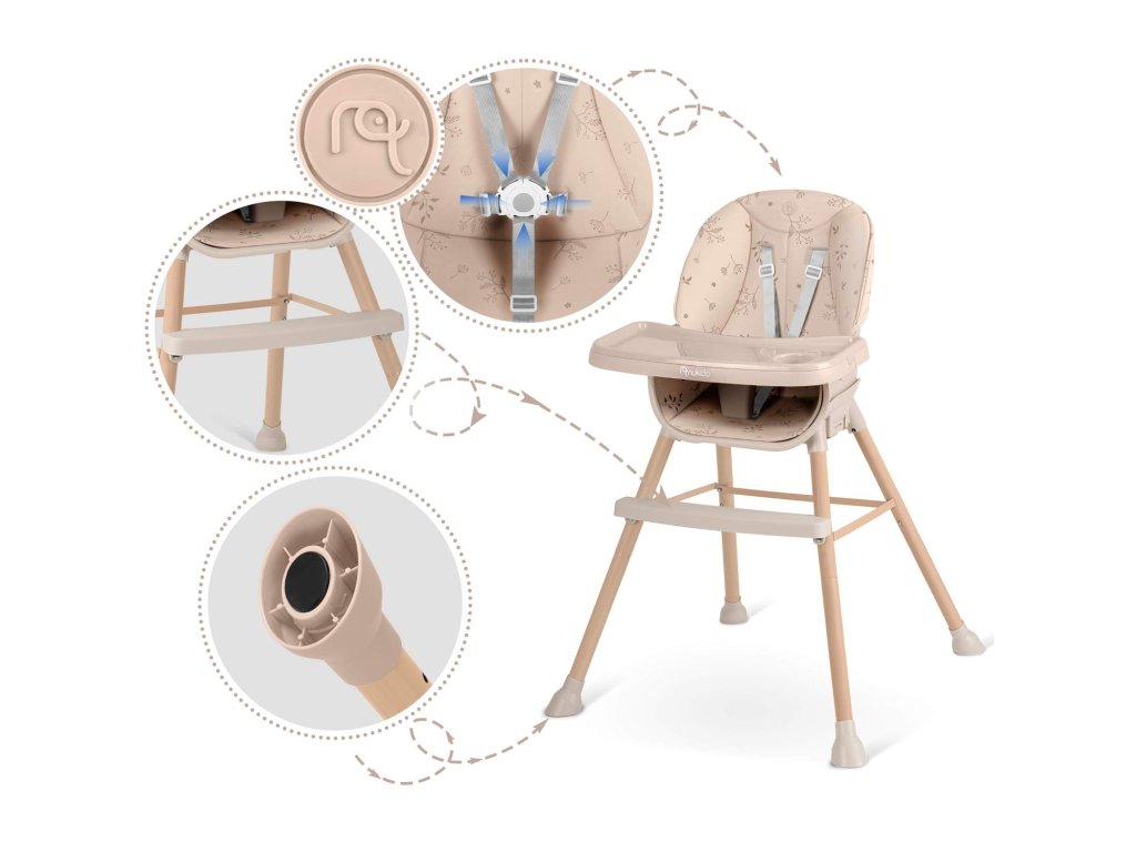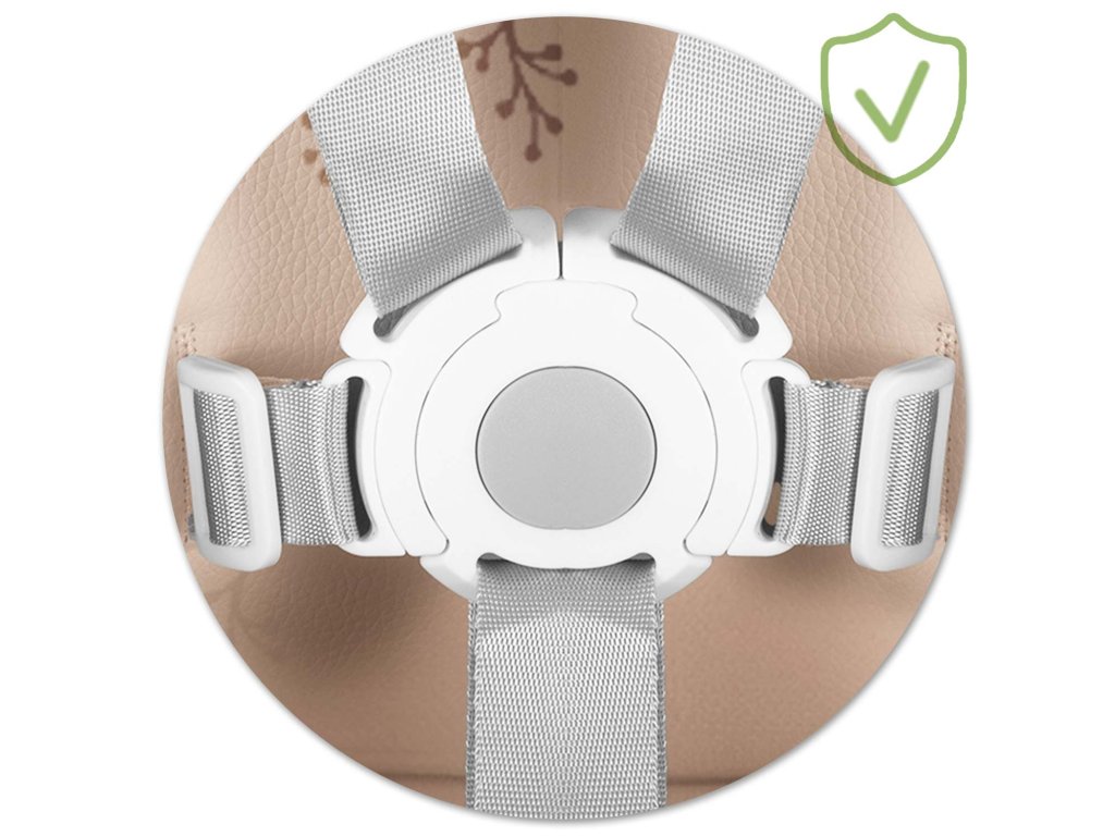 Dodatna zaščita, 5-točkovni varnostni pasovi, ki preprečujejo samodejno sprostitev otroka iz stolčka. Pasove je mogoče popolnoma odstraniti, ko niso več potrebni.