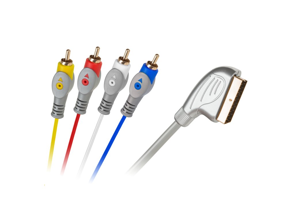 Kabel povezalni Euro - 4RCA Dolžina kabla: 1,5 m Barva: siva Kabel namenjen za prenos avdio-video signalov. Kabel je treba priključiti na naprave, ki so izključene iz omrežja. V primeru težav priporočamo, da preverite, ali je kabel pravilno priključen.Kabel povezalni Euro - 4RCA