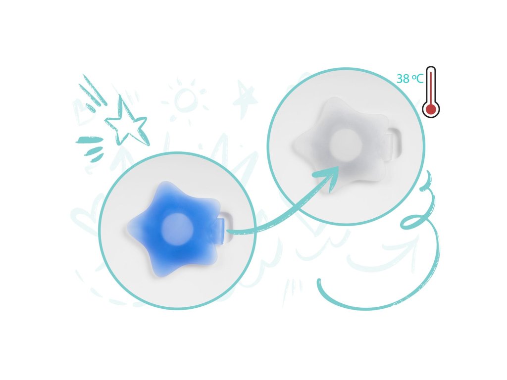 Če temperatura vode preseže 38 °C, se zamašek v obliki zvezde spremeni iz modre v belo barvo.