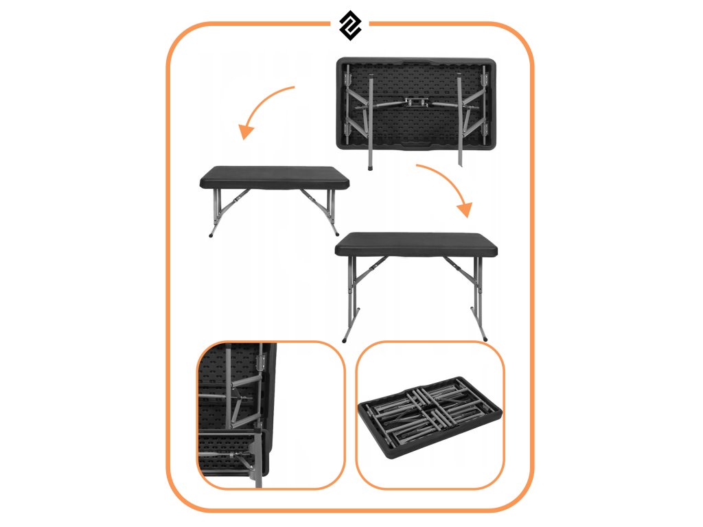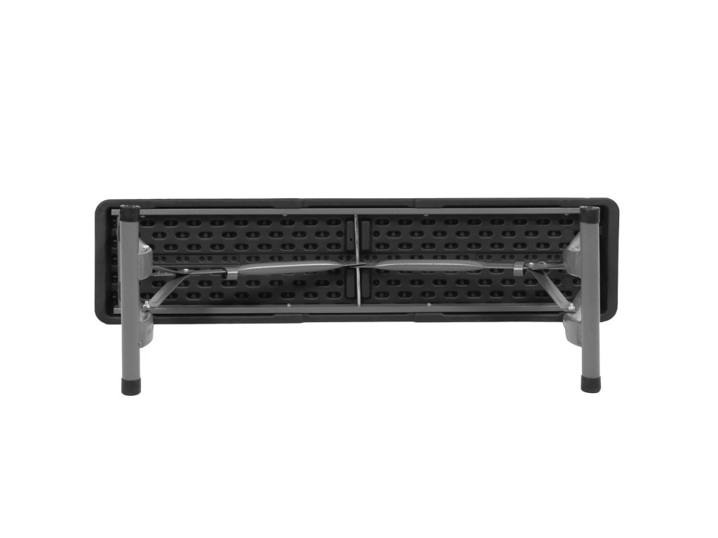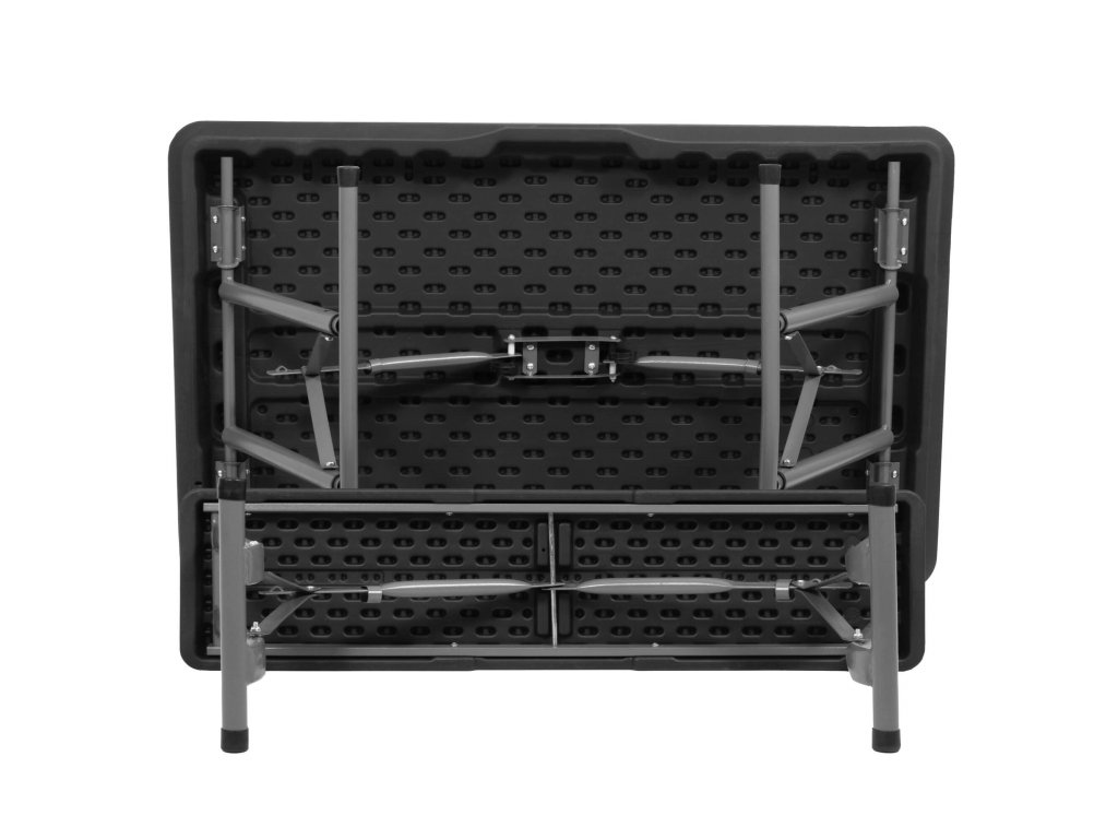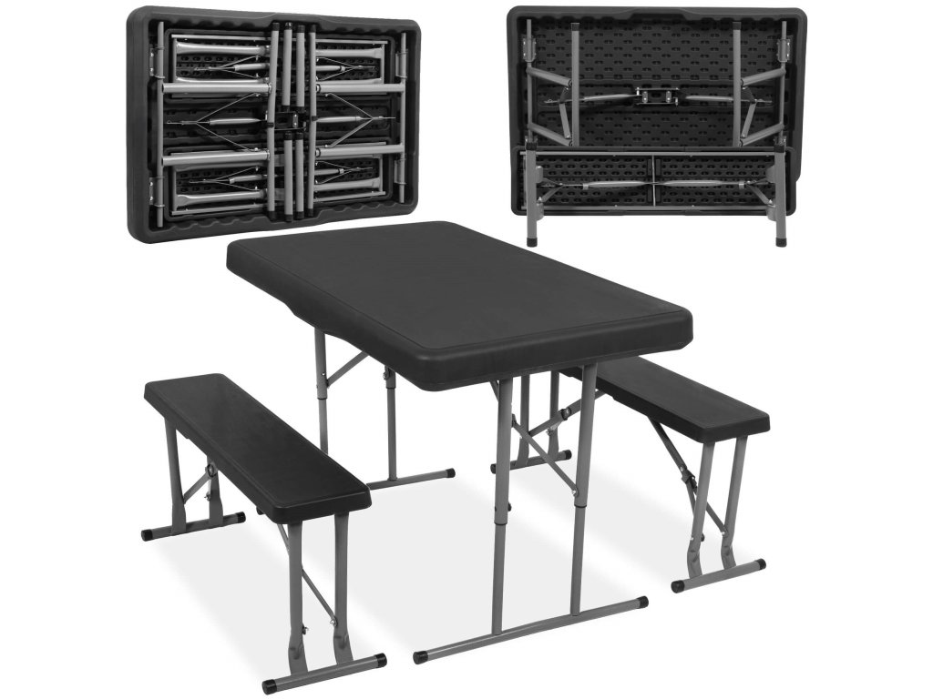 - Zložene klopi se v celoti skrijejo znotraj zložene mize, zato so zložene dimenzije celotnega kompleta enake kot dimenzije zložene mize