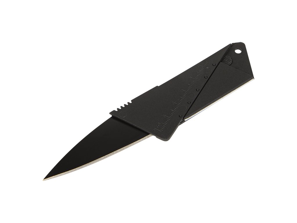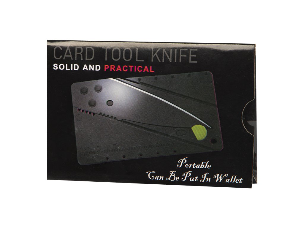 - Karta je izdelana iz elastičnega umetnega materiala. Ko je razprta, spominja na bančno kartico, ko je zložena, pa je funkcionalen nož.