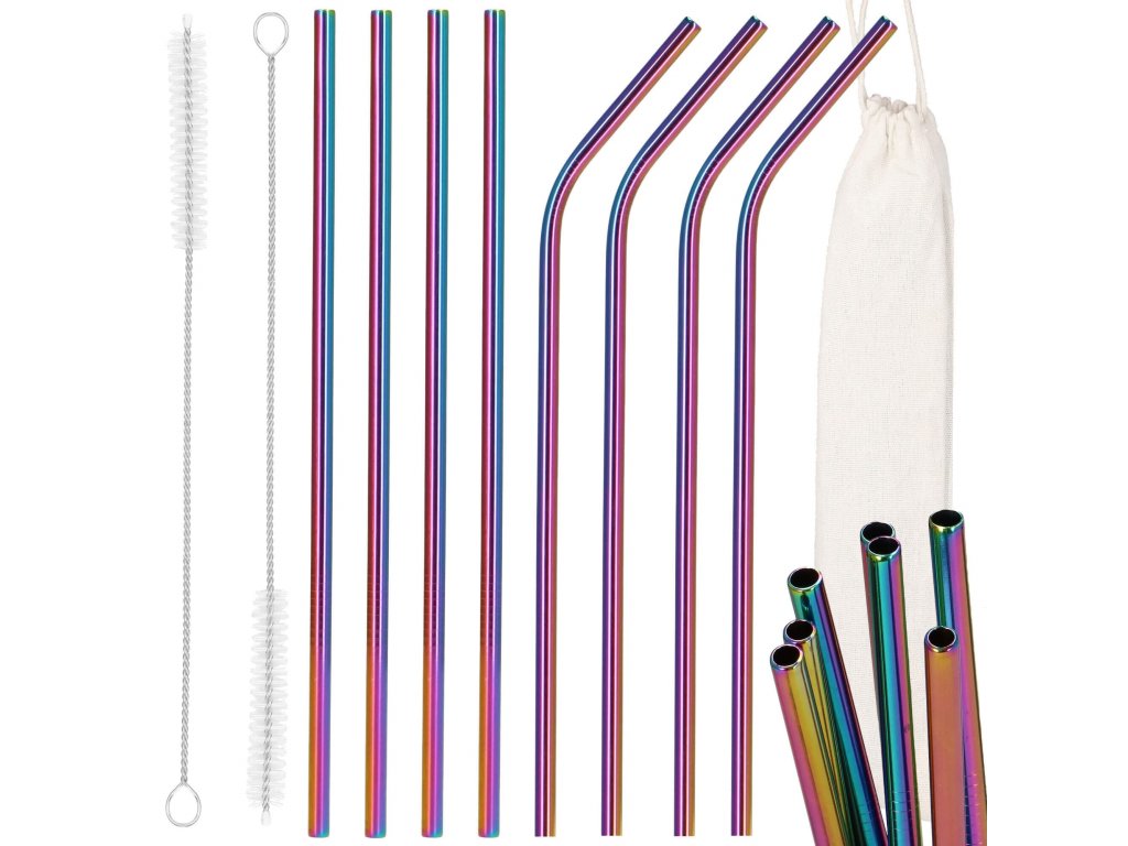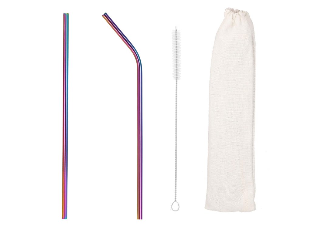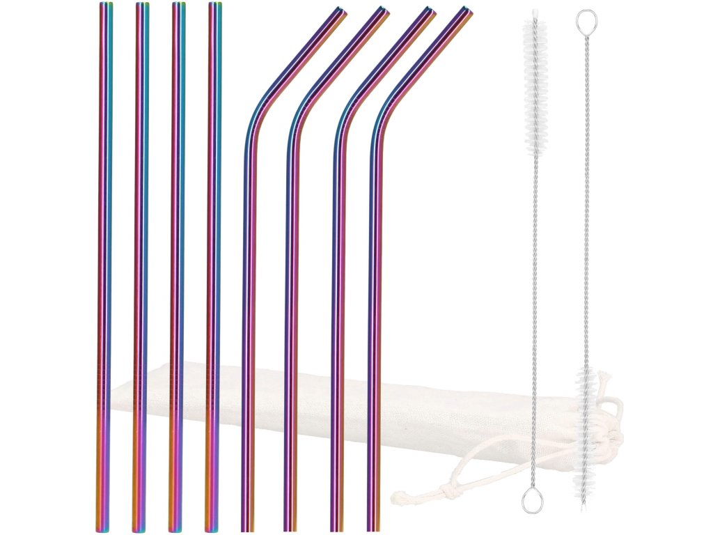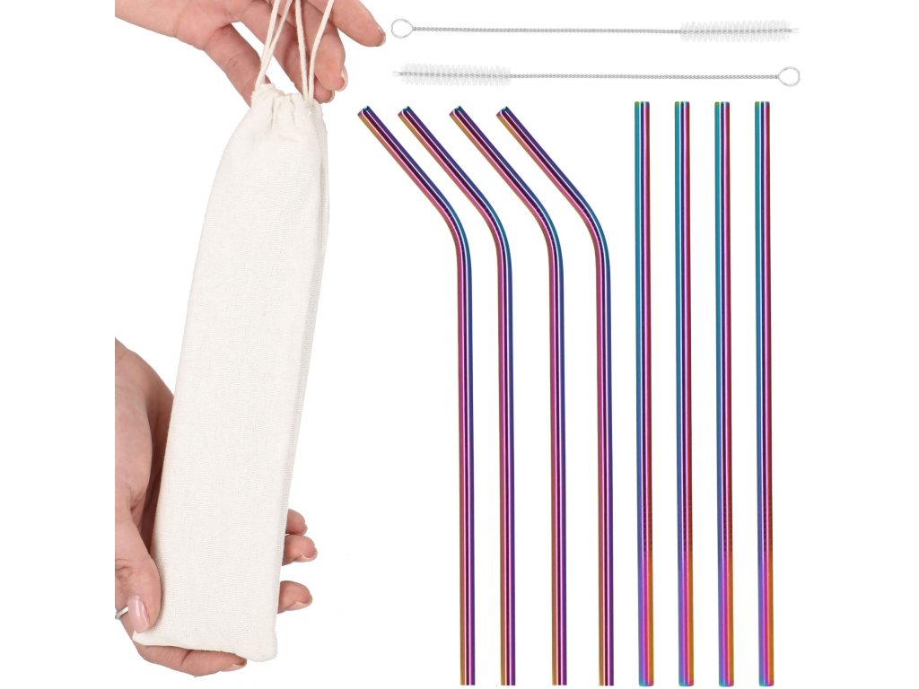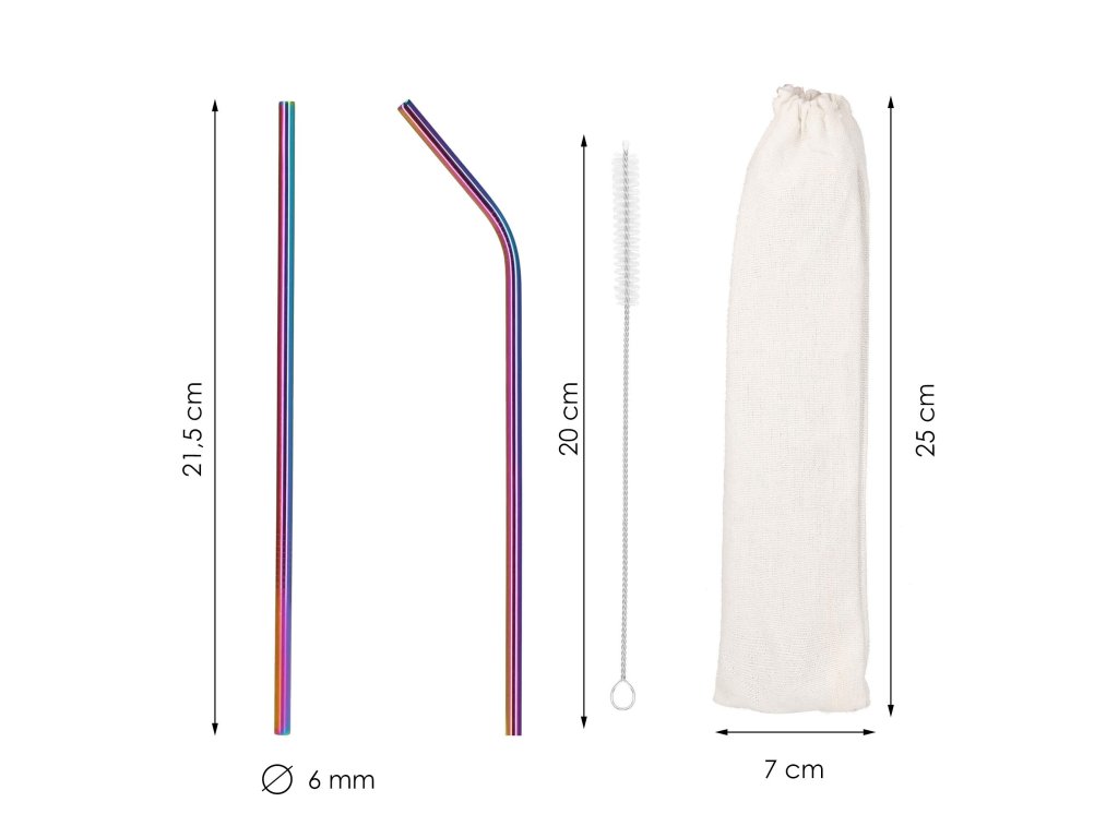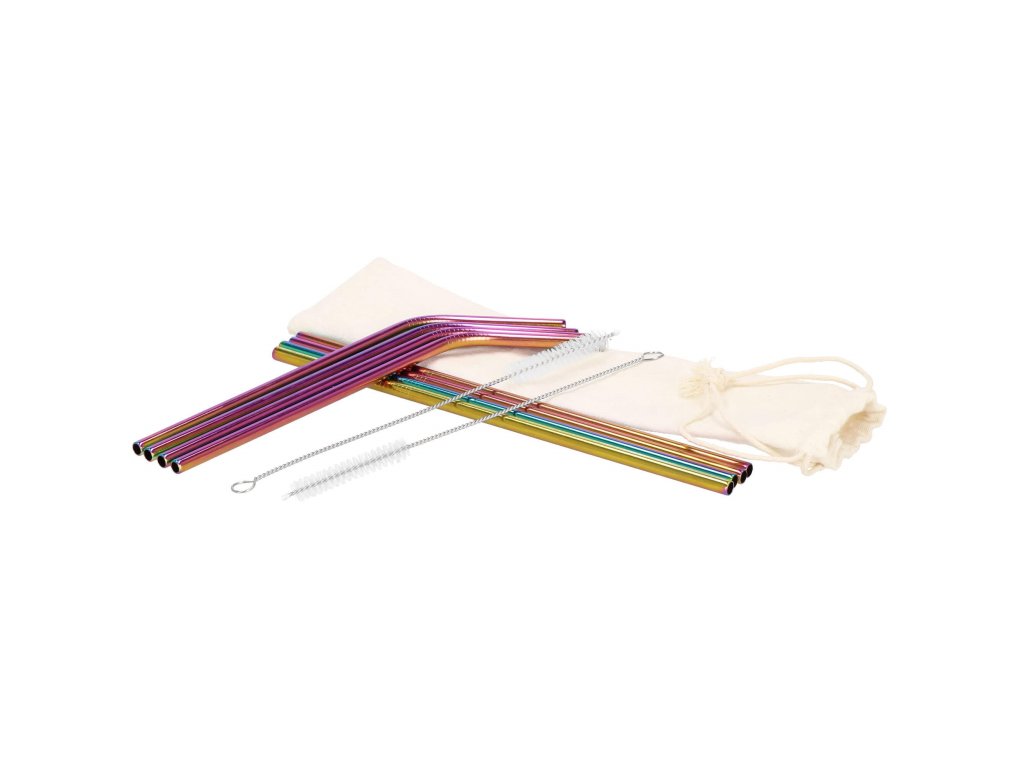 Set barvnih slamčic za pijačo s čistilno krtačo in platnenim etuijem.
