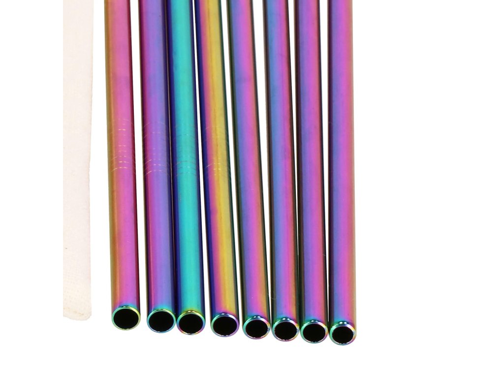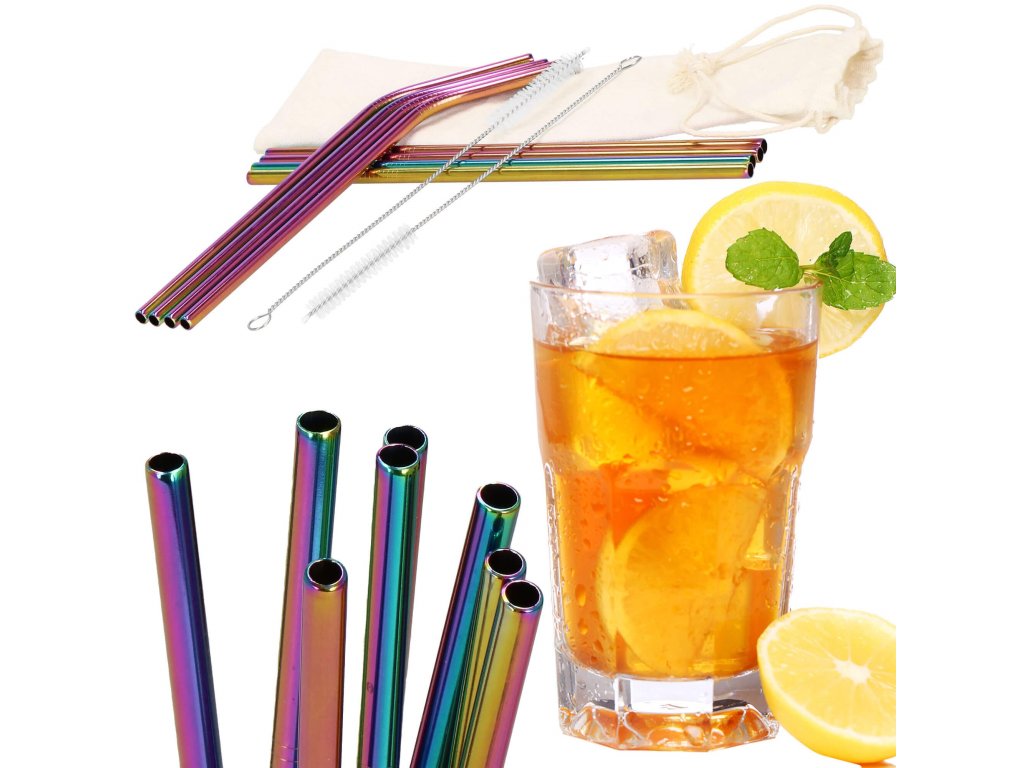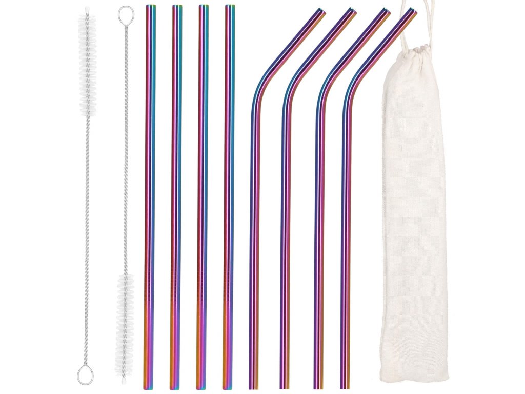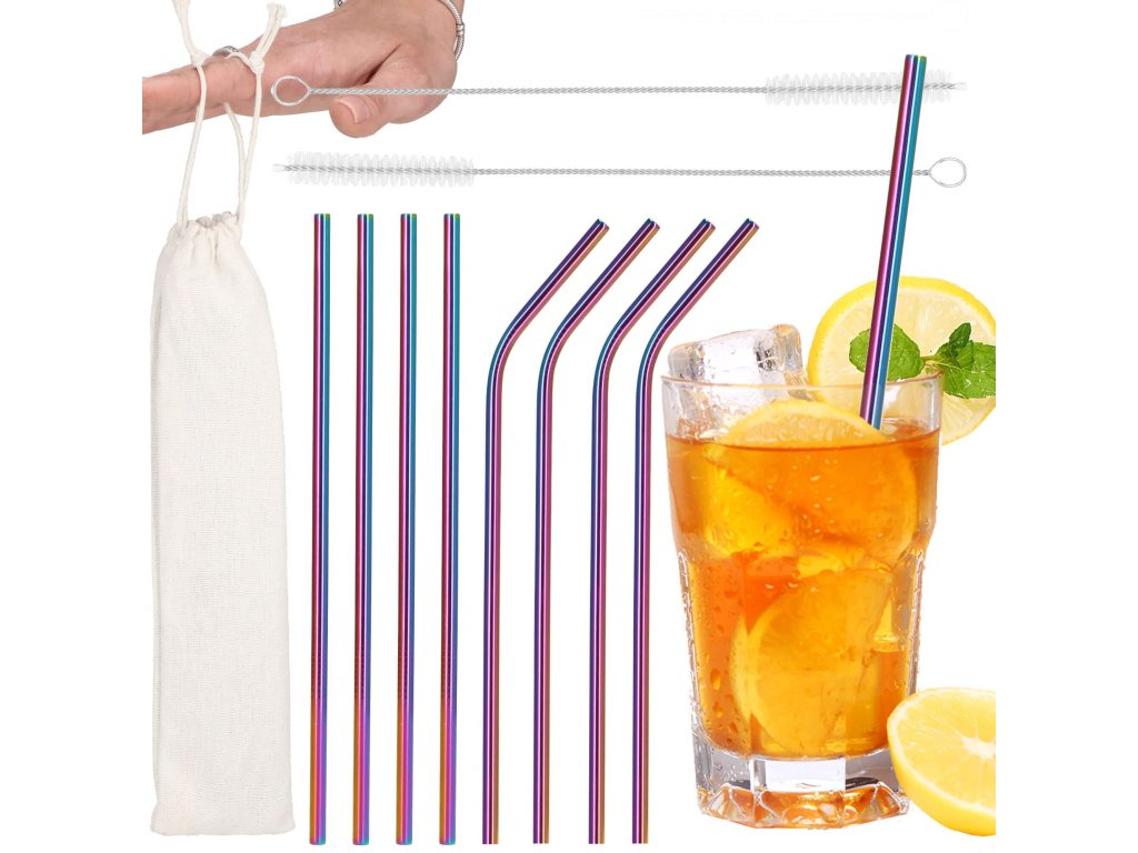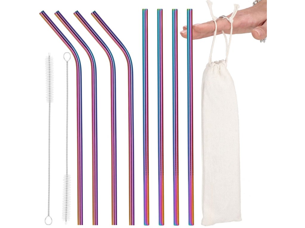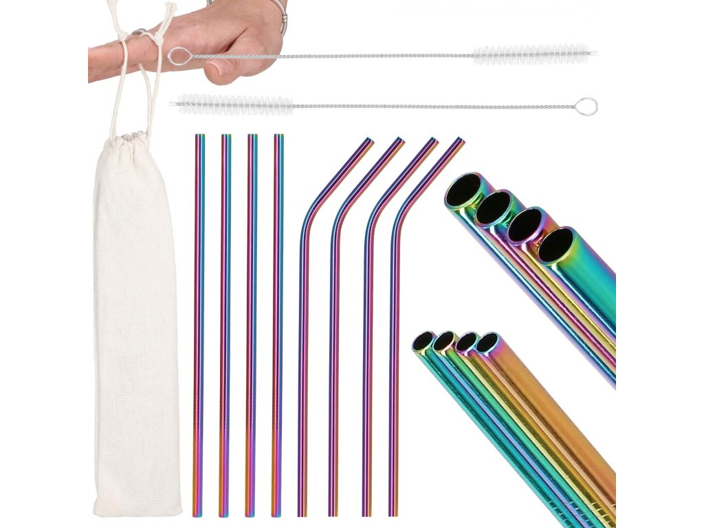 Set barvnih slamčic za pijačo s čistilno krtačo in platnenim etuijem.