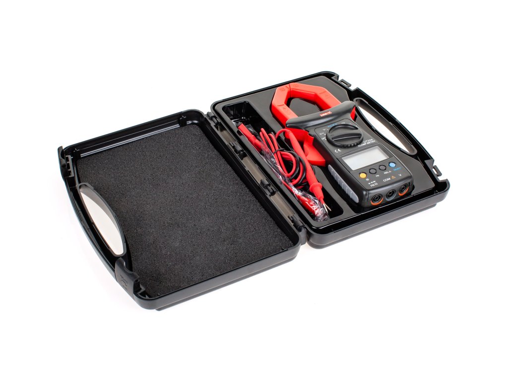 MERILNA OBMOČJA Napetost DC: 400 mV / 4 V / 40 V / 400 V / 600 V ±(0,8%+1) Napetost AC: 4 V / 40 V / 400 V / 600 V ±(1,2%+5) Izmenični tok AC: 400 A / 1000 A ±(2%+5) Upor: 400 Ohm / 4 kOhm / 40 kOhm / 400 kOhm / 4 MOhm / 40 MOhm ±(1%+2) Kapaciteta: 40 nF / 400 nF / 4 µF / 40 µF / 100 µF; ±(3%+5) Temperatura: -40°C ~ 1000°C (1%+3) Frekvenca: 10 Hz / 100 Hz / 1 kHz / 10 kHz / 100 kHz / 1 MHz / 10 MHz ±(0,1%+3) Delovni cikel: 0,1%-99,9% Preverjanje kontinuiranosti vezja Preizkus diod DODATNE FUNKCIJE Samodejna sprememba merilnih območi Zamrznitev zadnjega prikaza Funkcija relativnega merjenja Samodejni izklop Osvetljen LCD zaslon Osvetlitev čeljusti Indikator nizke ravni baterije Največje odčitavanje: 4000 SPLOŠNE ZNAČILNOSTI Vhodna impedanca enosmerne napetosti: cca. 10 MOhm Napajanje: baterija 9 V (6F22) Odprtina čeljusti: 40 mm Velikost zaslona: 52 x 27 mm Dimenzije: 106,4 x 257 x 52 mm Teža izdelka: 522 g Dodatki: baterija, merilni kabli, kratki merilni kabli s krokodili, sonda za merjenje temperature, etuiMERILNA OBMOČJA