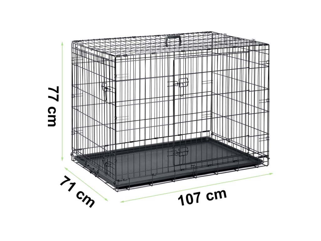 - Dvojna vrata – sprednja in stranska – omogočajo enostaven dostop in prilagodljivost pri postavitvi kletke.