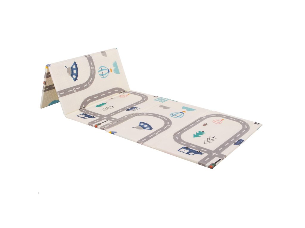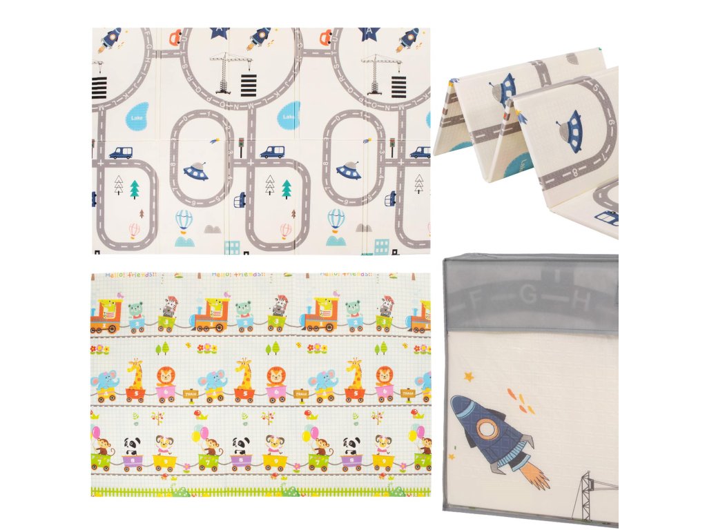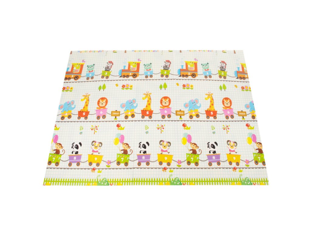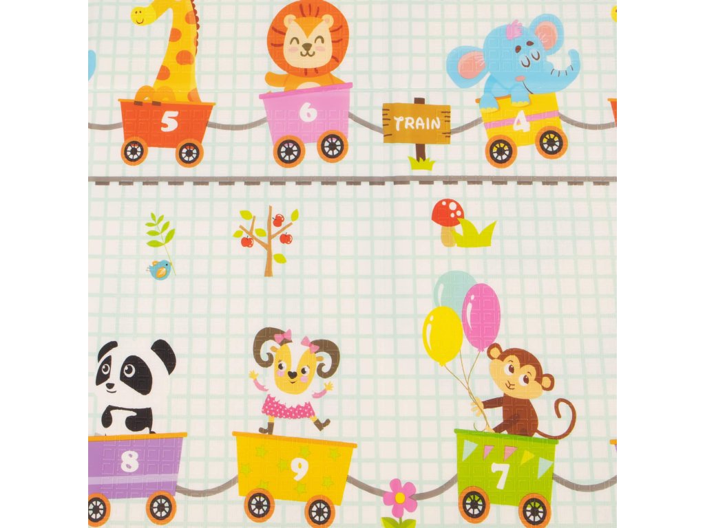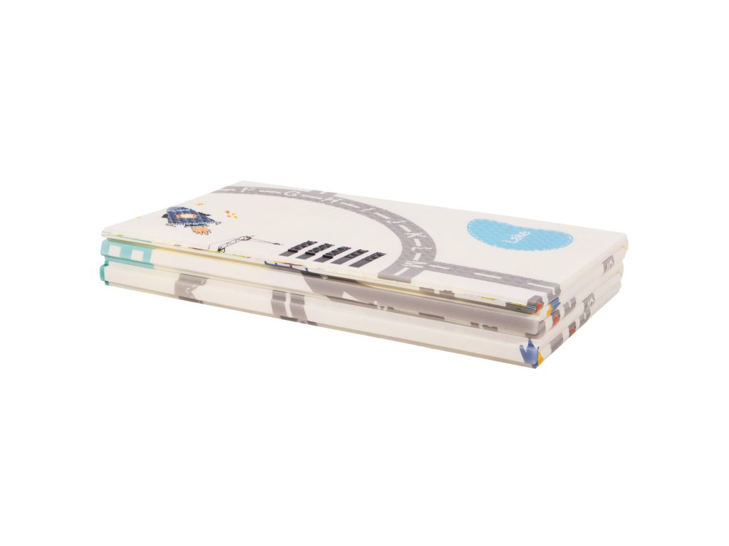 - Podloga je dvostranska. Na eni strani je vzorec ulic in vozil na kremni podlagi. Na drugi strani podloge je vzorec pisanih vlakov z živalmi in modra šahirana na kremni podlagi.