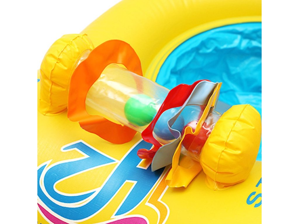 Ku kolesu sú pripojené farebné hrkajúce loptičky, ktoré spestria hru a podporia dieťa v učení sa plávať.