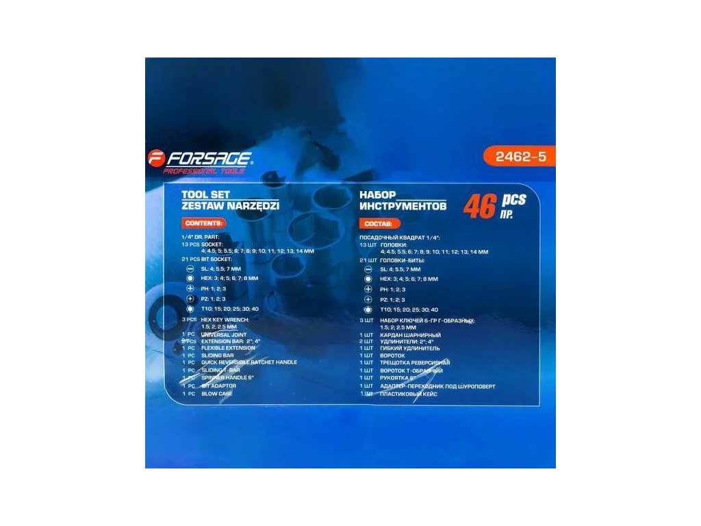 Set petih 1/4" sestoji iz 46 elementov, izdelanih iz visoko kakovostne krom-vanadijeve jekla.