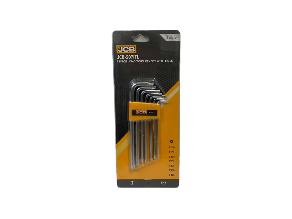 Set 7 dolgih TORX ključev s otvorom (varni TORX, tip H/TN) blagovne znamke JCB je nepogrešljivo orodje za delo s komponentami, zaščitenimi pred tatvino. Zaradi prisotnosti otvora v palici (v sredini konice), ključi omogočajo vijakovanje in odvijanje posebnih varnostnih vijakov, ki se uporabljajo npr. v elektroniki, alarmnih sistemih, industrijski avtomatizaciji, servisu gospodinjskih aparatov ali vozil.
