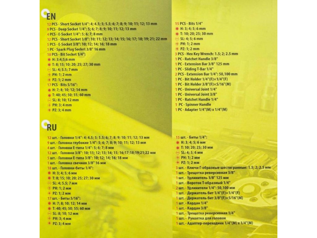 Set klenkovih ključev z 108 elementi v originalni torbi. Torba je zasnovana in izdelana iz visokokakovostne plastike. V setu boste našli vse potrebno za domačega mojstra ali avtomobilskega navdušenca.