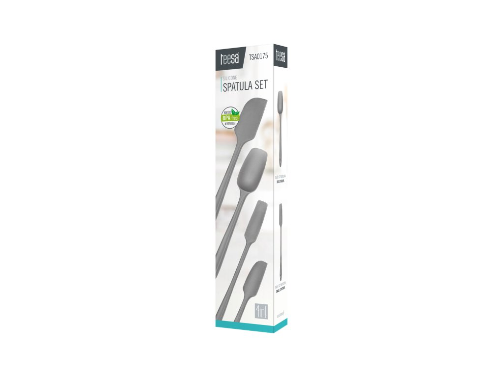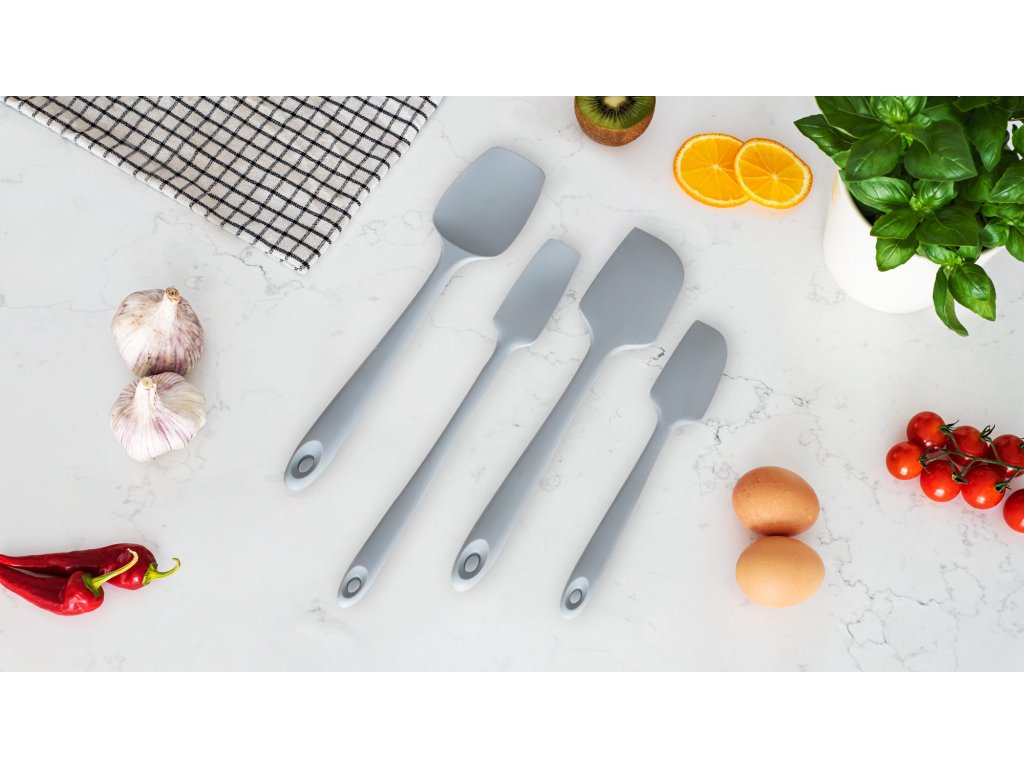 Če še nimate svojega kompleta, nujno preverite silikonske lopatice Teesa. V kompletu so 4 elementi različnih dimenzij in uporabe. Lopatice so netoksične, brez vonja in imajo nelepljivo površino – idealne za vse kuhinjske naloge. Opozoriti velja, da silikonski, nežni robovi omogočajo, da s temi pripomočki zagotovo ne boste popraskali loncev ali ponev.