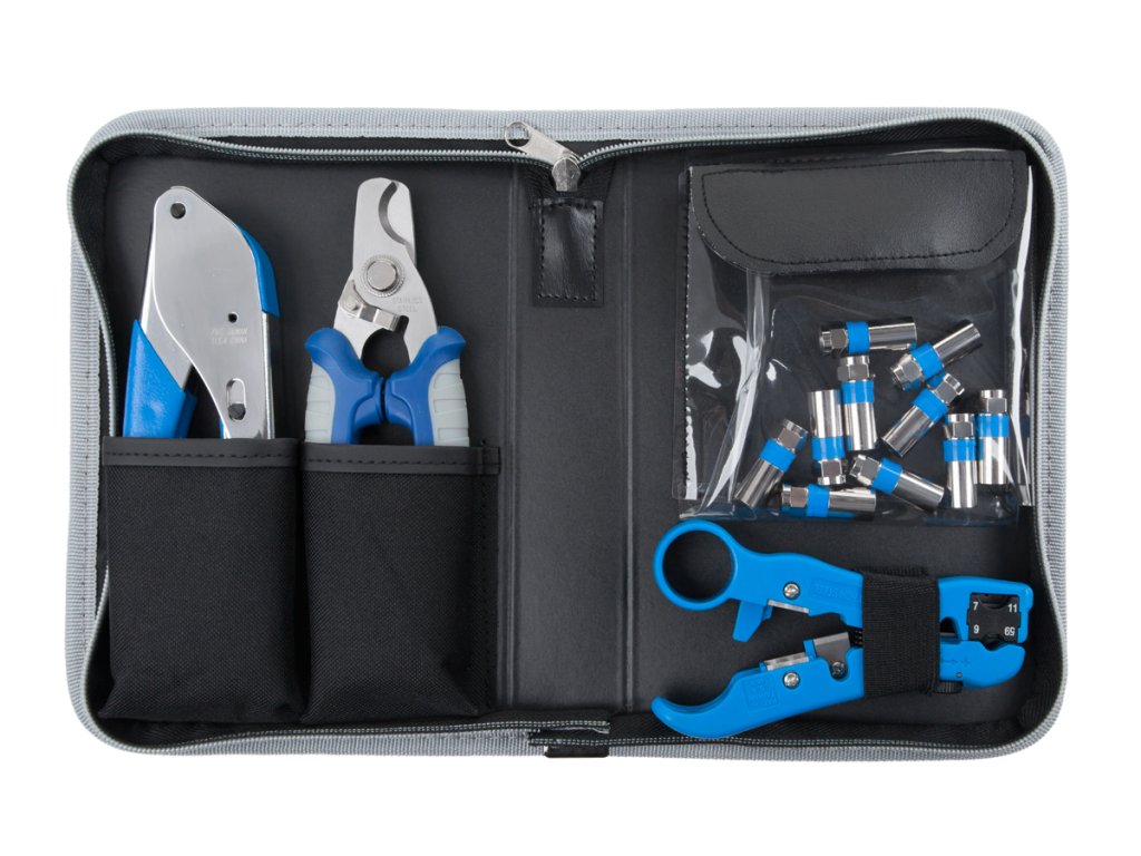 Komplet vključuje: Stiskalnica za vtiče: združljiva s kabli RG6, RG6 Quad, RG59 in F vtičem Univerzalni odstranjevalec izolacije: reže in odstranjuje izolacijo s kablov RG6, RG6 Quad, RG59, RG7, RG11, računalniških Cat5, Cat5e, Cat6 in ploskih telefonskih.Komplet vključuje: