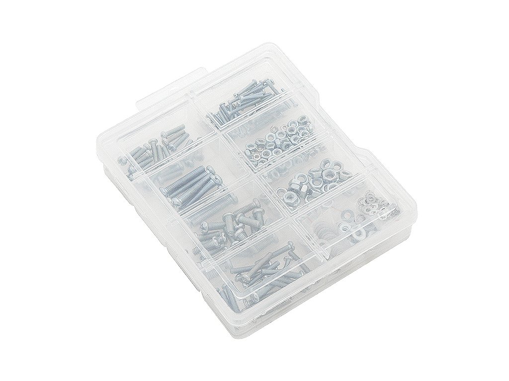 Set vsebuje širok izbor križnih vijakov s cilindrično glavo, matic in podložk v priročnem prozornem organizatorju. Set je primeren za domačo uporabo ter za delavnice in servise.