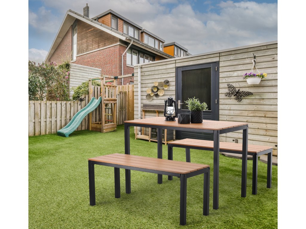 Komplet vrtnega pohištva iz serije Garden Line je idealen izdelek za festivale, žetve in vsa podobna zunanja dogodka. Okvirni elementi so izdelani iz jekla s prašnim premazom, kar zagotavlja trajnost in odpornost proti vremenskim vplivom. Miza in sedeži so izdelani iz plastičnih desk, ki posnemajo les, kar jim daje estetski in moden videz.