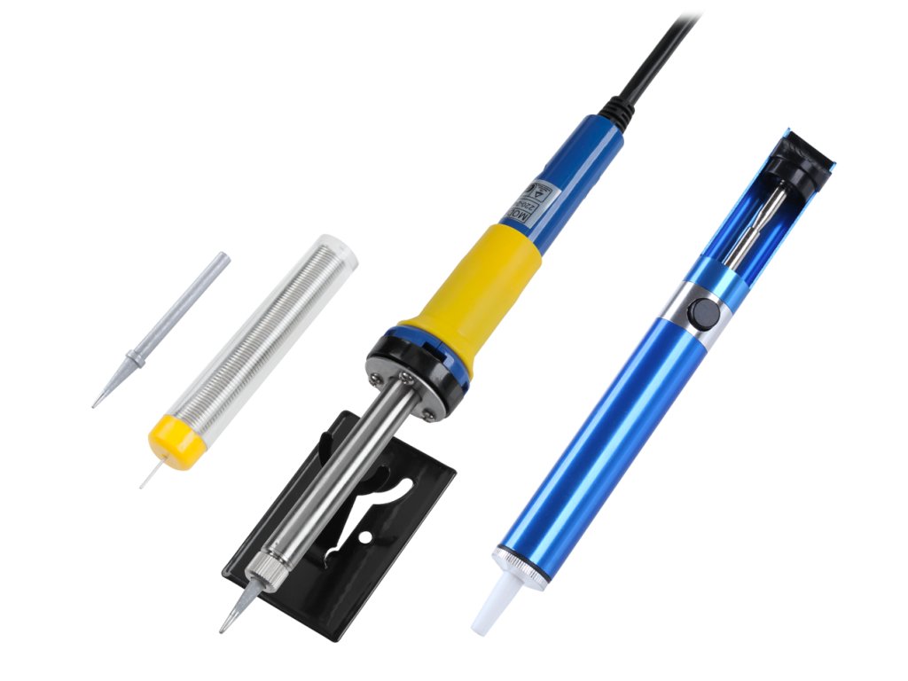V kompletu: spajkalna naprava, kovinski sesalec z dodatno konico, cin, rezervna konica, stojalo za spajkalno napravo