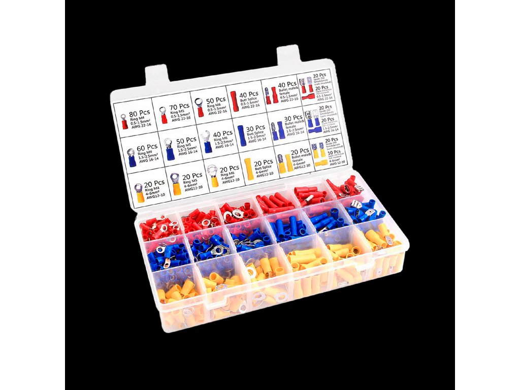 Komplet priključkov 700 kos + orodje za stiskanje S pomočjo trdnega kompleta, sestavljenega iz orodja za stiskanje in 700 kabelskih končnikov, je mogoče hitro in natančno izvesti električno napeljavo. Orodje je zasnovano za delo v širokem obsegu stiskanja (stiskalne čeljusti v treh velikostih z barvnimi oznakami), opremljeno je s sklopnim mehanizmom, ki ne zahteva velike sile in zagotavlja pravilno stiskanje. Barvne oznake velikosti kabelskih končnikov in orodja za stiskanje olajšajo delo. Standardni kabelski končniki so pregledno razvrščeni v praktičnem shranjevalnem zabojčku. Izolirani različni stisljivi priključki so dostavljeni v trdni embalaži iz prilagodljive plastike Embalaža omogoča vizualni nadzor in preprečuje mešanje različnih priključkov. Opis priključkov: Material: PVC + baker Shranjevalna škatla: plastična Napetost: 600 V. Velikost: Rdeč: AWG 22-18 ustreza žici / kablu 0,5-1,5 mm2 Modri: AWG 16-14 ustreza žici / kablu 1,5-2,5 mm2 Rumeni: AWG 12-10 ustreza žici / kablu 4,0-6,0 mm2Komplet priključkov 700 kos + orodje za stiskanje