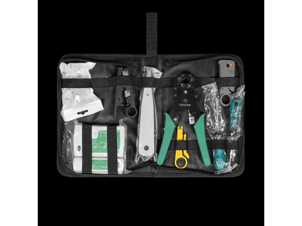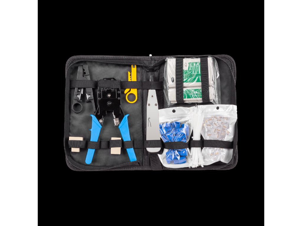 Komplet omrežnih orodij 9 elementov LAN + etui Komplet orodij za izgradnjo računalniških omrežij: klešče RJ9 RJ11 RJ12 RJ45, vgrajen odstranjevalec in rezalnik orodje za zabijanje tipa KRONE – višji model odstranjevalec izolacije s konico za stiskanje vtičnic LSA tipa KRONE tester RJ9 RJ11 RJ12 RJ45 20 vtičev RJ45 20 zaščit na vtiče komplet 20 zateznih trakov delilnik RJ45 cev RJ45 etui Komplet namenjen za profesionalce kot tudi domače uporabnike.Komplet omrežnih orodij 9 elementov LAN + etui
