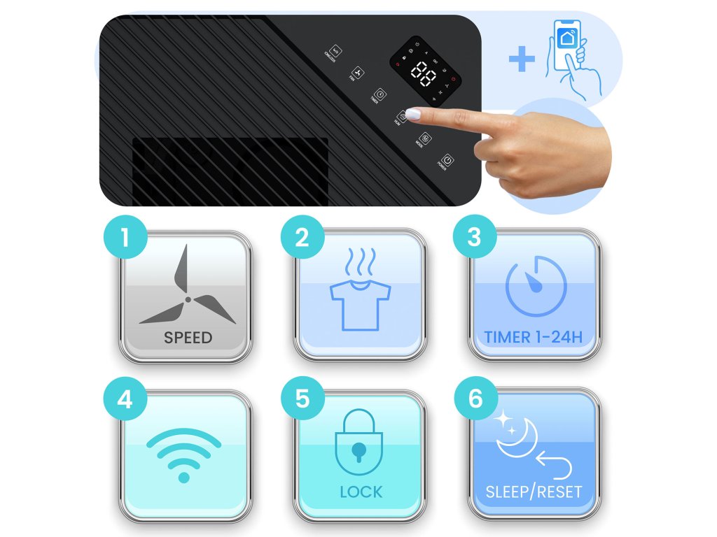 - Učinkovitost sušenja [l/24h]: 20 (pri vlagi 80%) ali 25 (pri vlagi 90%)