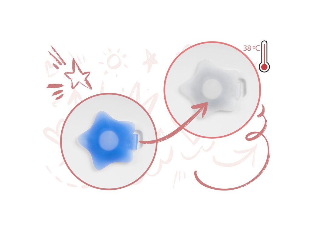 Če temperatura vode preseže 38 °C, čep v obliki zvezde spremeni barvo iz modre v belo.