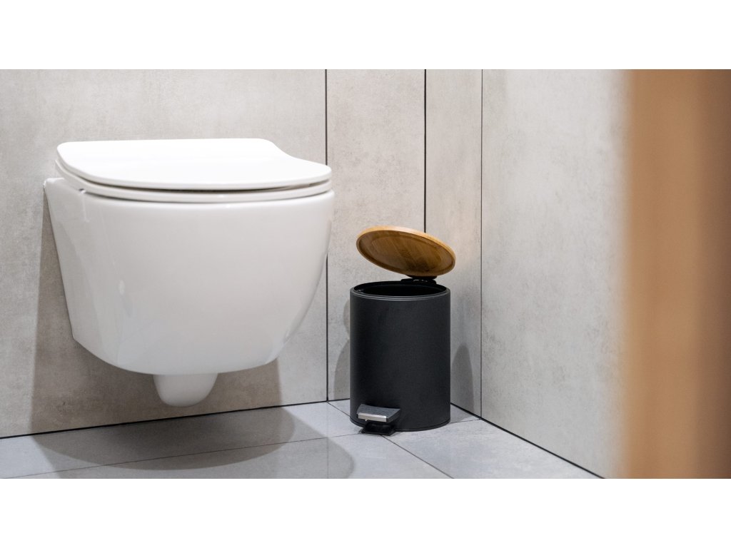 Pozabite na kompromise! Koš za smeti za kopalnico bi moral izpolnjevati vaša pričakovanja ne le glede uporabnosti, ampak tudi estetsko. Črno, mat ohišje koša Teesa je izdelano iz prašno barvanega železa, ki v kombinaciji z bambusovim pokrovom ustvarja stilski pripomoček, ki se odlično ujema z moderno notranjostjo kopalnic. Kar je pomembno, vam ni treba skrbeti, da bo železno ohišje pustilo praske na tleh. Koš za smeti Teesa ima osnovo iz umetne mase, ki preprečuje praskanje površine.