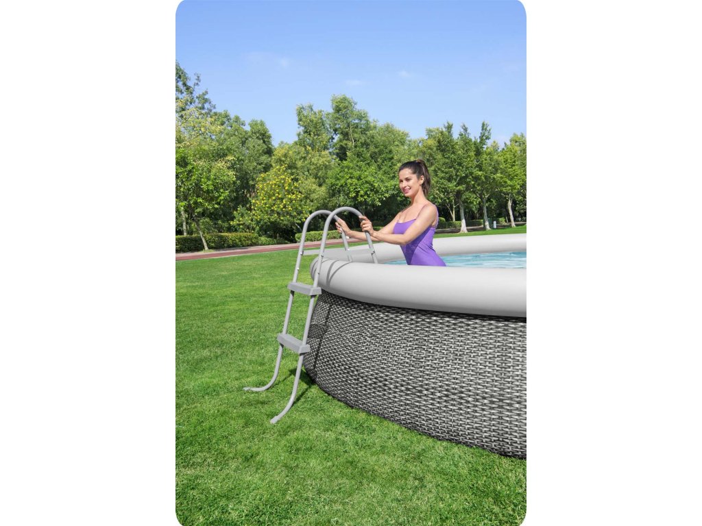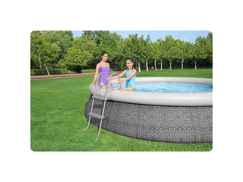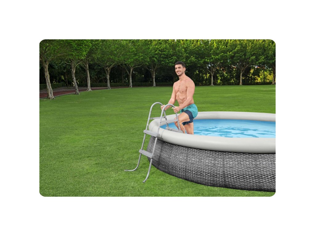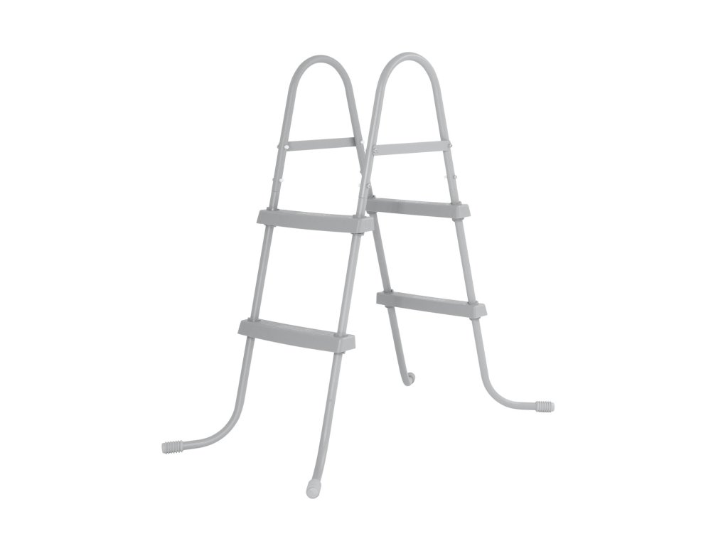 Bazenjska lestev Bestway je odporna na poškodbe in veliko obremenitev, njeno konstrukcijo pa sestavlja kovinski okvir. Nedrseča površina stopnic preprečuje nesrečne padce, udobni ročaji pa omogočajo vzdrževanje ravnotežja.