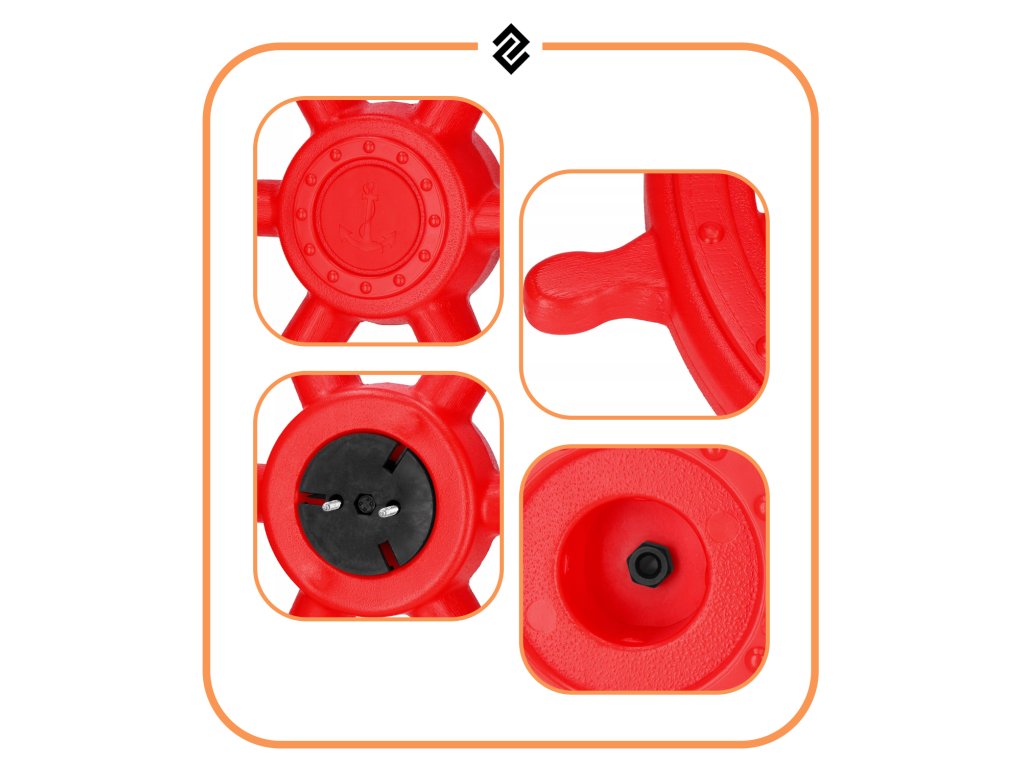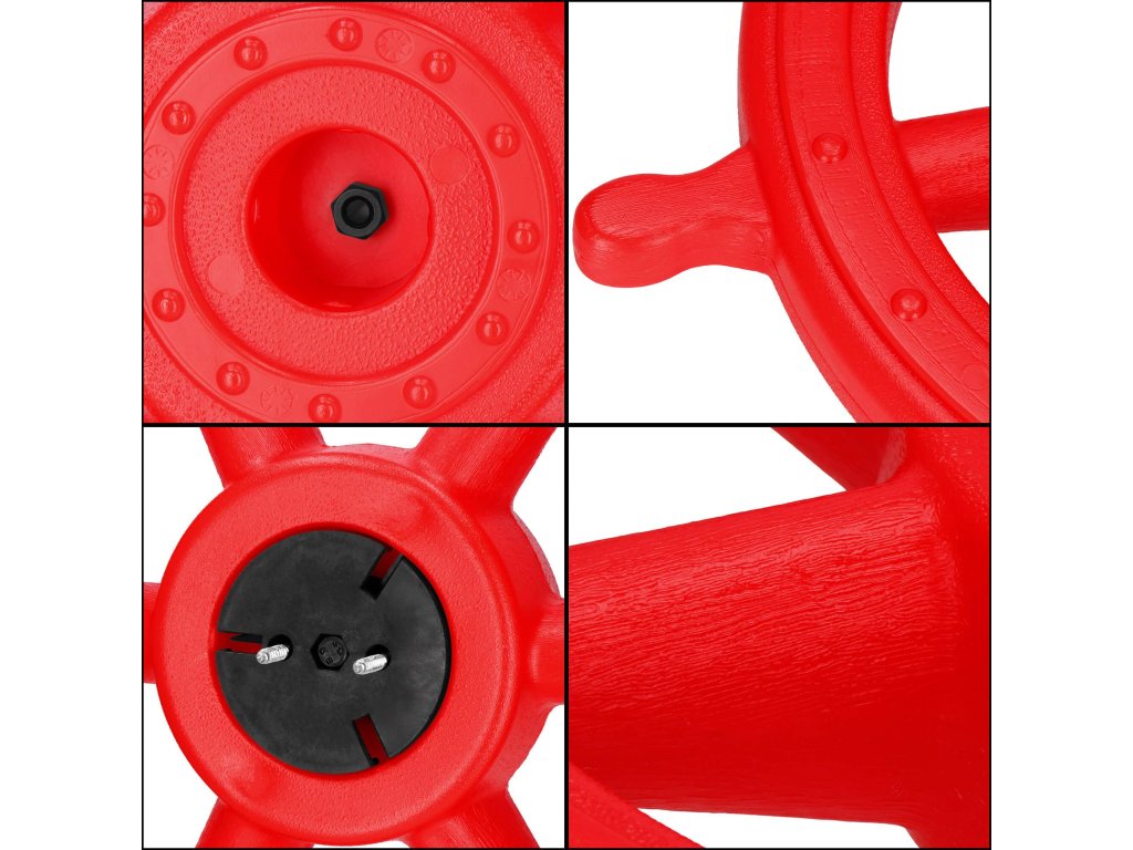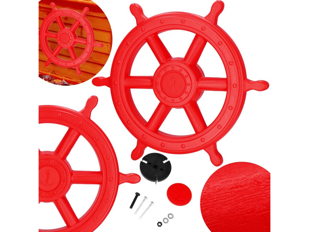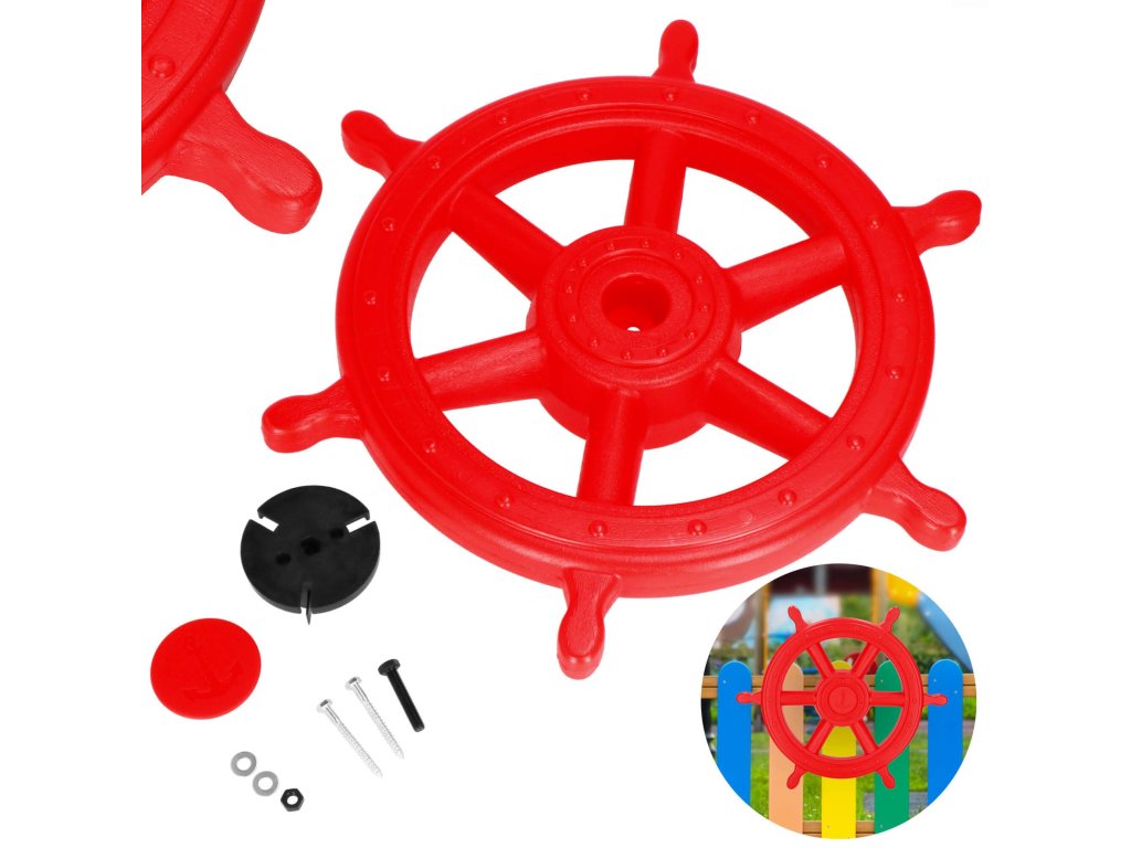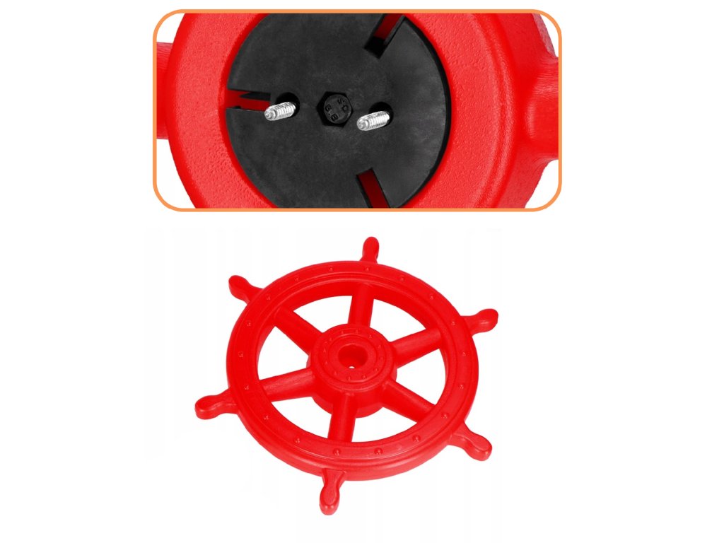 - Paket vsebuje: krmilni obroč, rdeč sprednji pokrovček, črni montažni element za steno, 2x vijaka + podložke za pritrjevanje elementa na steno, 1x vijak + matica za pritrjevanje krmilnega obroča
