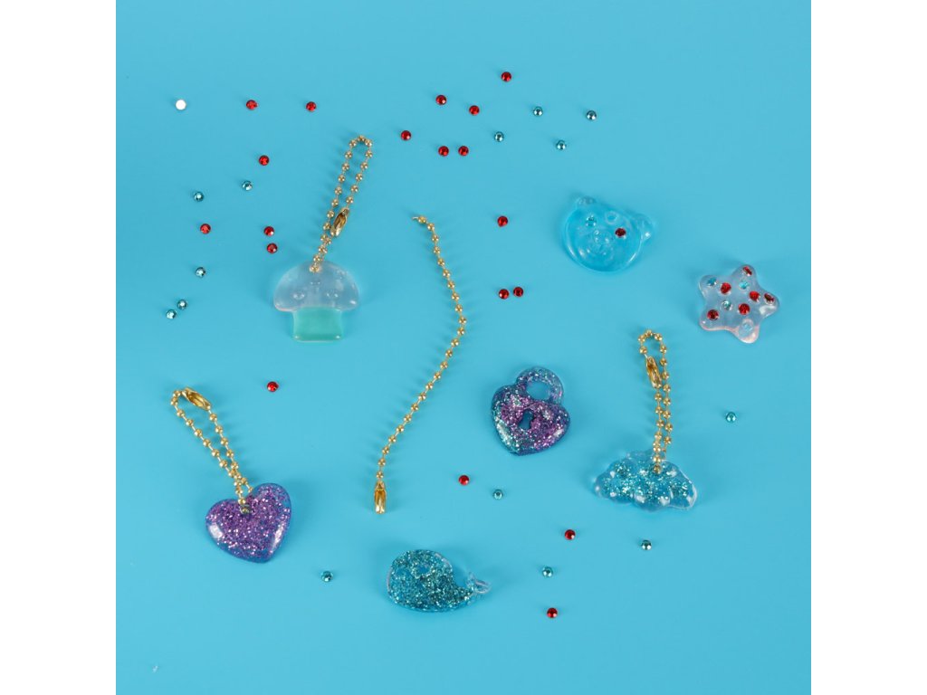 Komplet vsebuje štiri tube lepila v rdeči, zeleni, modri in beli barvi, kot tudi štiri kalupe z različnimi oblikami. Dodatniokrasni elementi, kot so bleščice in majhni kristali, omogočajo okrasitev nakita na poljuben način. Delo olajšajo dodatki, kot sta pilica in pinceta.