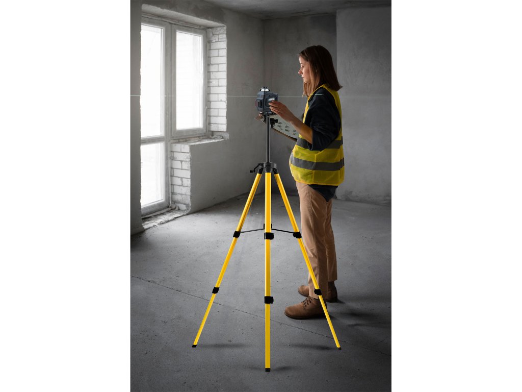 - Laserska libela zahteva popolno izravnavo, da zagotovi natančne linije. Stativ odpravlja tveganje naključnega premika naprave, kar je ključno za natančnost dela.