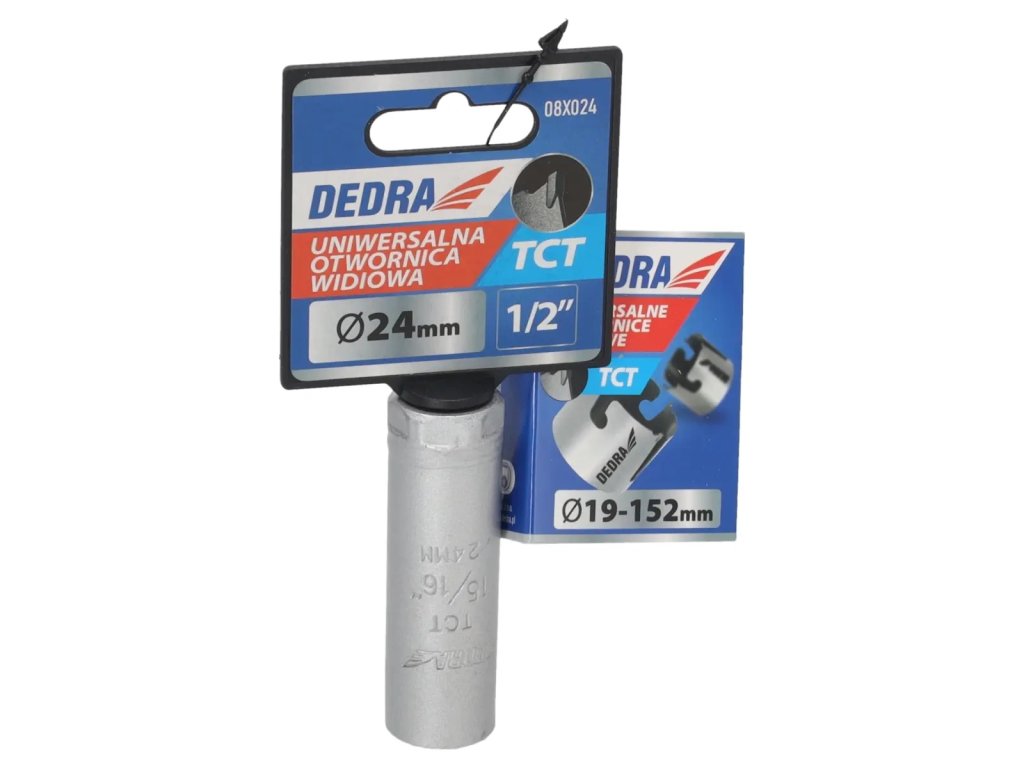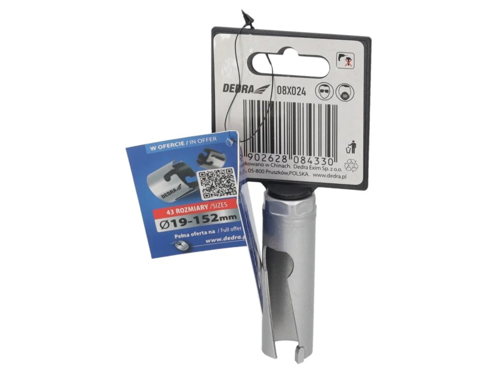 Prava velikost je navedena v opisu izdelka.Univerzalna žaga za luknje je nepogrešljivo orodje v delavnici za domače mojstre. Posebna konstrukcija rezalnega roba povečuje trdnost žage in izboljšuje vodenje luknje. S pomočjo vpenjalnih glav HEX 10 mm 1 /2" 08X001 (priporočeno za luknje: 08X019-08X030) in 5/8" vpenjalnih glav 08X002 (priporočeno za luknje: 08X032-08X152) je mogoče uporabljati žage za luknje na vrtalnikih ali vrtalnih strojih. S pomočjo vpenjalnega glave SDS+ 08X003 (priporočeno za luknje: 08X032-08X152) je mogoče uporabljati žago za luknje DEDRA 08 X widespread z udarnimi vrtalniki v načinu brez udarca. Za izboljšanje rezalnega učinka in povečanje trdnosti imajo luknje večiložilne vložke, ki učinkovito obdelujejo material. Univerzalni pilotni svedri DEDRA 08 X se lahko z uporabo ustreznega pilotnega svedra uporabljajo za delo v lesu, kovinah, pohištvenih ploščah, PVC, mineralnih materialih, kot so keramične ploščice, porobeton in silikati. Za povečanje trdnosti lukenj je jedro izdelano iz visoko kakovostnega jekla HCS št. 45 z debelino 1,5 mm, zobje pa so izdelani iz karbidne volframove zlitine s 6 % kobalta (volframovo jeklo YG 6X). To izboljšuje kakovost in trajnost odrezkov ter povečuje učinkovitost vrtanja.