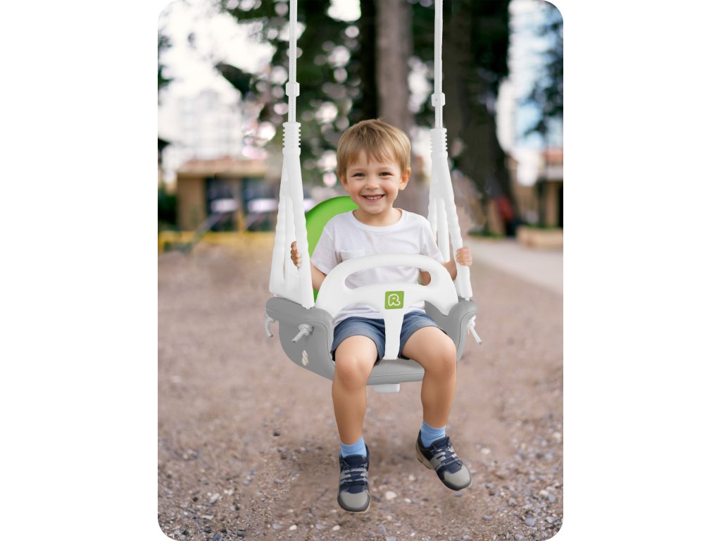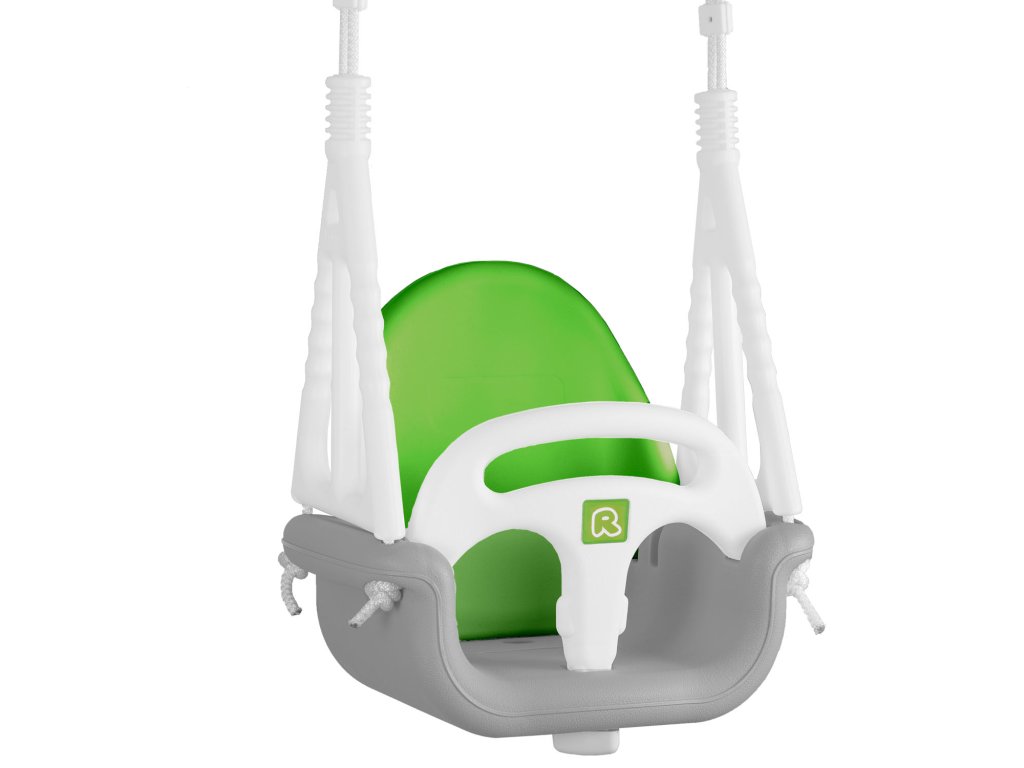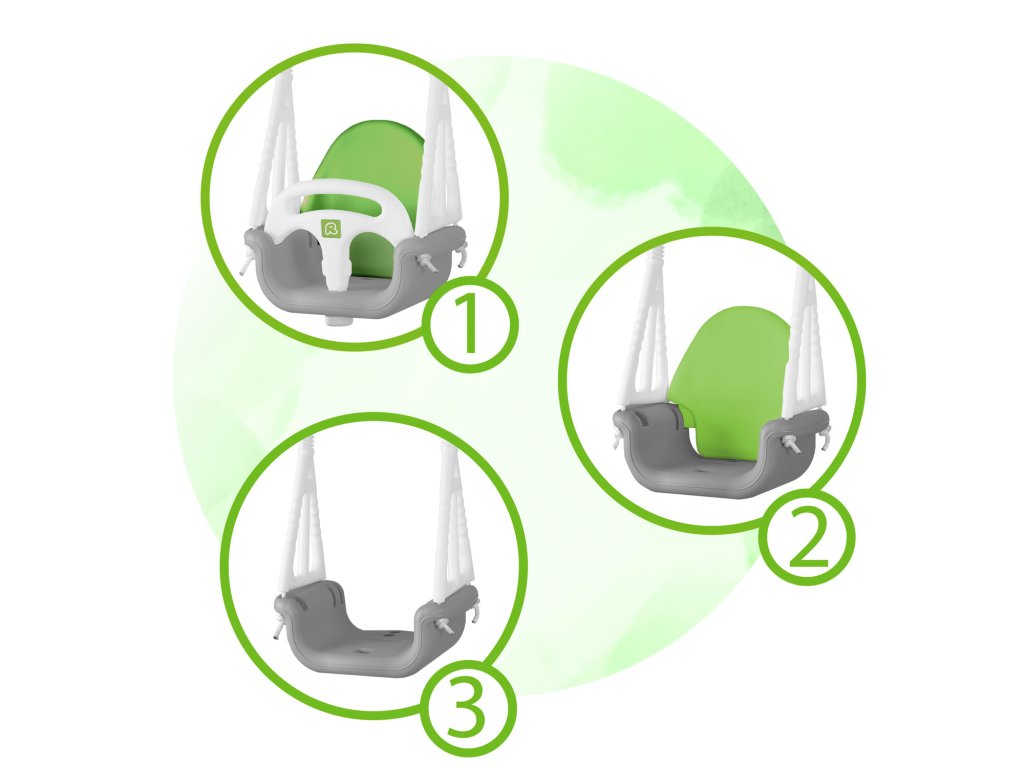 - močne vrvi dolžine do 130 cm z možnostjo nastavitve s kovinskimi sponkami, vrvi so dodatno zaščitene s posebnimi plastiki, ki ščitijo otrokove roke pred morebitnimi odrgninami in povečujejo stabilnost med guganje