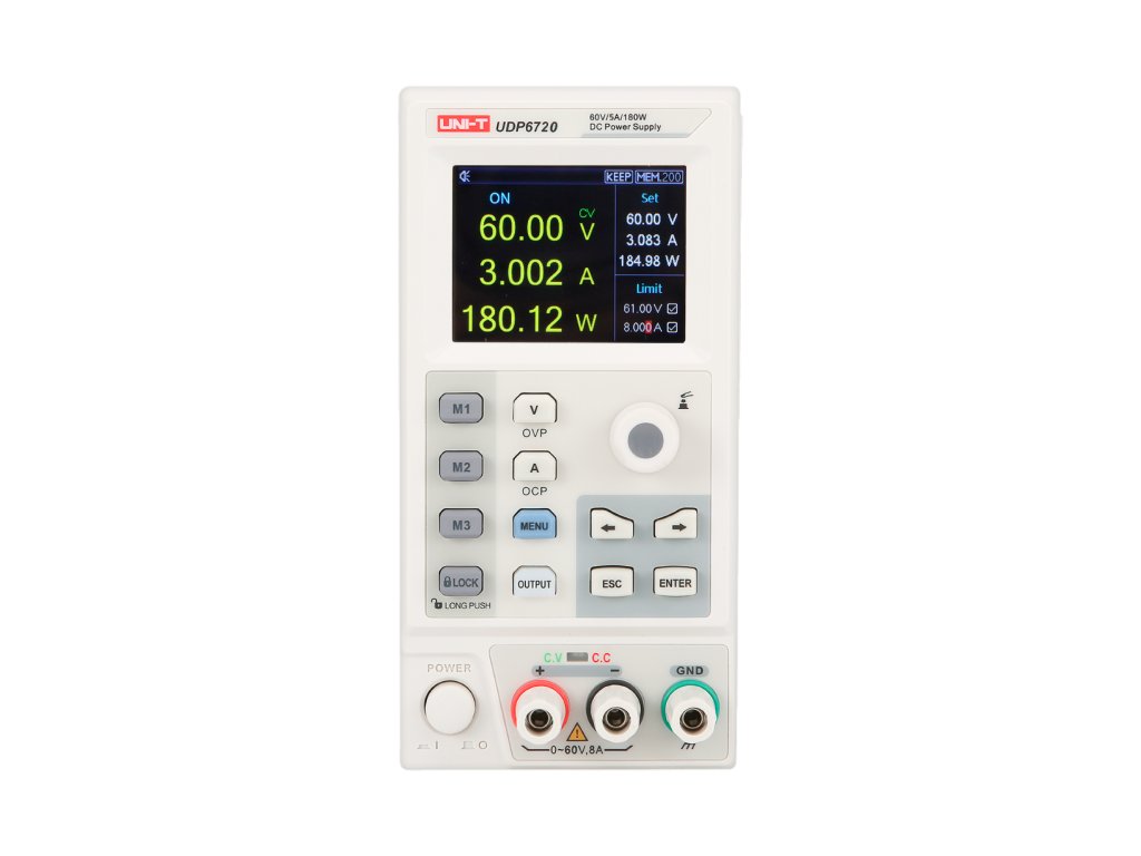 UDP6720 ponuja izhodno napetost v razponu od 0 do 60 V in tok do 5 A, z največjo močjo do 100 W. Napajalnik odlikuje visoka ločljivost regulacije 10 mV/1 mA po celotnem območju, kar zagotavlja izjemno natančnost nastavitev. Regulacija obremenitve in napajanja se ohranja na ravni <0,01%+3 mV za napetost ter <0,01%+3 mA za tok, kar zagotavlja stabilno in natančno napajanje tudi v najbolj zahtevnih aplikacijah.