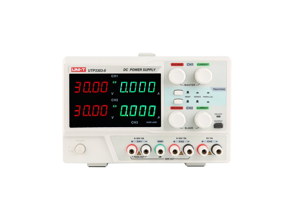 UTP3303-II ponuja nastavljivo izhodno napetost v razponu od 0 do 32 V in tok do 3 A na dveh glavnih kanalih, kar zagotavlja izhodno moč do 207 W. Naprava se odlikuje po izjemni stabilnosti, z natančnostjo stabilizacije napetosti na ravni <0,01%+3 mV in toka <0,2%+3 mA. Visoka ločljivost nastavitve (10 mV za napetost in 1 mA za tok) omogoča natančne nastavitve in prilagoditve parametrov specifičnim zahtevam.