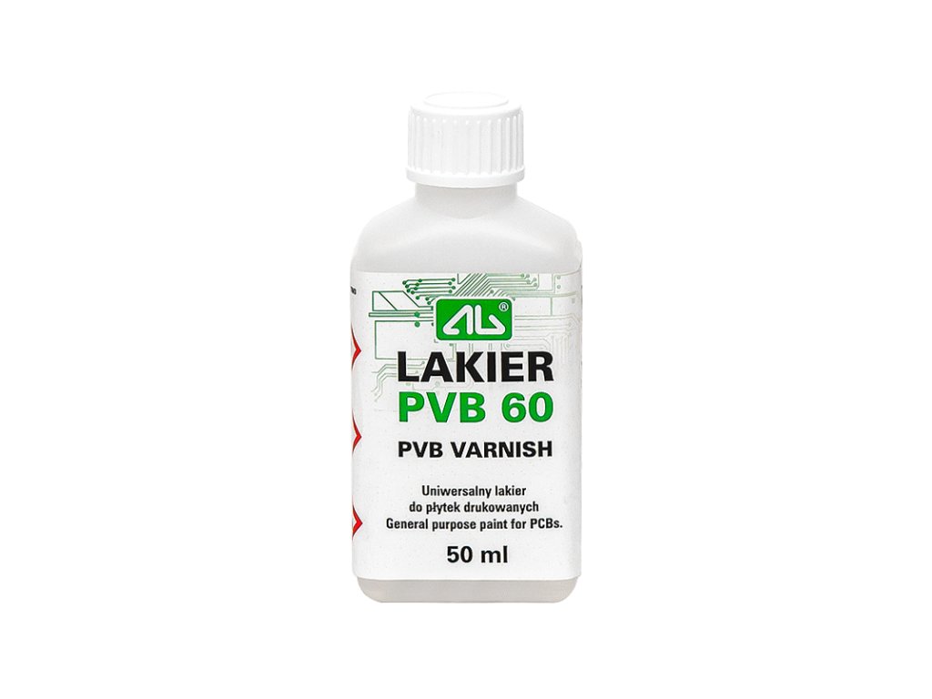 Hitro sušeči prozoren premaz PVB z dobrimi izolacijskimi lastnostmi. Ščiti pred korozijo tiskana vezja in druge elemente, ki delujejo v neugodnih atmosferskih pogojih. Premaz ščiti tiskana vezja pred nastankom potujočih tokov in kratkimi stiki. Pri serijski proizvodnji je možno nanos laka s čopičem, s potapljanjem ali s pršenjem. Če je mešanica preveč viskozna za pršilne naprave, jo je mogoče razredčiti z dodajanjem redčila. Natančno razmerje sestavin je treba določiti individualno. Izdelek mora biti ustrezno zaščiten med skladiščenjem. Lak je nagnjen k mreženju. Ustvari zaščitni in izolacijski sloj, ki ščiti pred atmosferskimi vplivi, kot so: vlaga, oksidacija, prah, kemične nečistoče; Dobro oprime površin kovin, plastike in lesa; Ustvari premaz, odporen na razredčene kisline, baze in atmosferske vplive; Možno je spajkanje skozi sloj laka; Preprečuje iskrivo in koronino razelektritev; Zmanjšuje preboje med potmi; Ne spremeni prosojnosti in elastičnosti tudi po daljšem času; Območje delovanja: od -50°C do +150°C. Vžigalna temperatura: 380°C.Hitro sušeči prozoren premaz PVB z dobrimi izolacijskimi lastnostmi. Ščiti pred korozijo tiskana vezja in druge elemente, ki delujejo v neugodnih atmosferskih pogojih. Premaz ščiti tiskana vezja pred nastankom potujočih tokov in kratkimi stiki. Pri serijski proizvodnji je možno nanos laka s čopičem, s potapljanjem ali s pršenjem. Če je mešanica preveč viskozna za pršilne naprave, jo je mogoče razredčiti z dodajanjem redčila. Natančno razmerje sestavin je treba določiti individualno. Izdelek mora biti ustrezno zaščiten med skladiščenjem. Lak je nagnjen k mreženju.