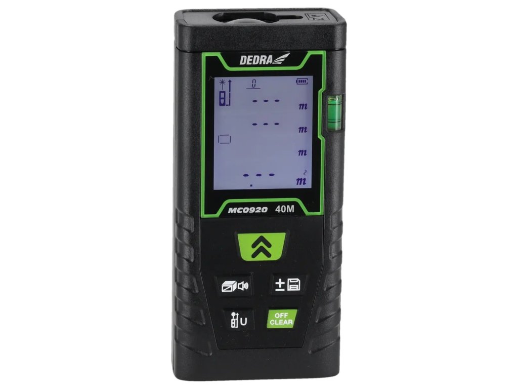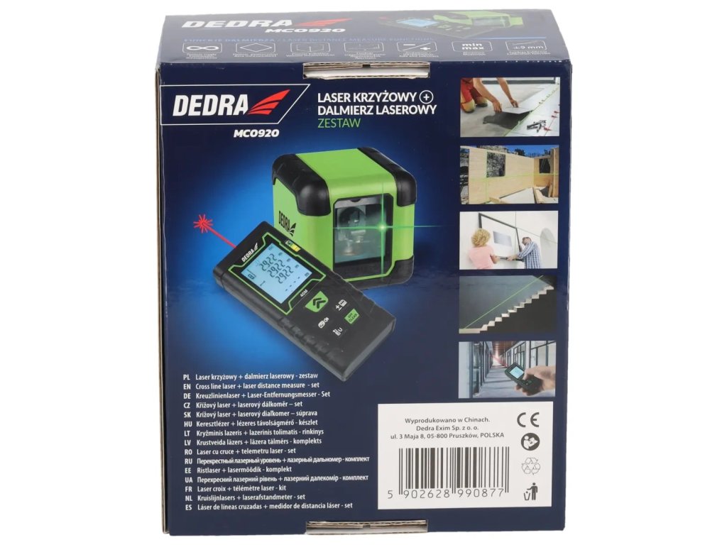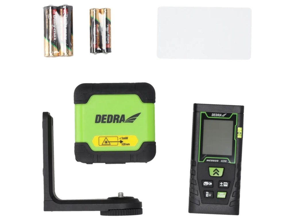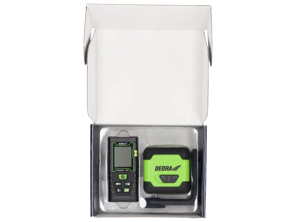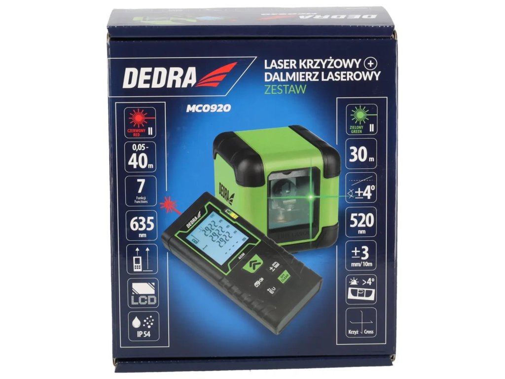 Komplet merilnih orodij DEDRA MC0920, sestavljen iz laserske libele in laserskega merilnika razdalje, je popolna rešitev za širok spekter natančnih del. Laserska libela DEDRA MC0920 je orodje, ki ga lahko uporabite ne samo pri obnovitvenih delih v gradbeništvu, temveč tudi pri okraševanju zidov in obešanju oblačil. Laser se lahko uporablja za samodejno označevanje prečnih črt. Doseg laserja je 30 m. Laser ima samonivelirni sistem 4°, ki nam omogoča delo brez potrebe po ročnem kalibriranju laserja. Robustno ohišje ščiti laser pred nenamerno poškodbo. Uporaba blagovne znamke diode OS RAM zagotavlja odlično vidljivost žarka tudi na soncu - zelena barva laserskega žarka.