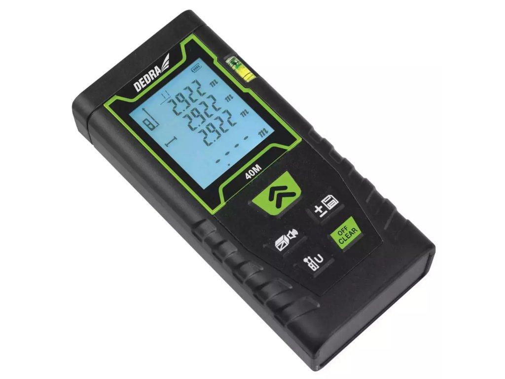 Laserski merilnik razdalje je idealno orodje za domače mojstre in montažne ekipe. Z laserskim žarkom lahko hitro in natančno merite razdalje do zanimivih površin, npr. izvrtano luknjo, okno, razdaljo med stenami. Z vgrajenimi funkcijami za izračun volumnov, površin itd., je delo mogoče opraviti hitreje in brez nepotrebnih napak. Z uporabo trigonometričnih funkcij omogoča laserski merilnik razdalje izračun višine stebra. To je uporabna in natančna metoda merjenja, če merjeni element nima točke, ki bi jo lahko izmerili, na primer strop ali oddaljena točka. Izmerite razdaljo do osnove in razdaljo do vrha elementa brez spreminjanja položaja. Naprava lahko iz teh podatkov izračuna višino ele m-p. Obseg merjenja z laserjem je od 5 mm do 40 m z izjemno natančnostjo ±3 mm/10 m, kar v primerjavi s standardnimi merilnimi metodami zagotavlja zelo visoko natančnost, čas merjenja pa je neprimerljivo krajši. V primeru močne sončne svetlobe priporočamo uporabo priložene odsevne plošče, ki olajša merjenje v takih pogojih in omogoča tudi merjenje na m r c-k a l o v o, steklenih, visoko absorpcijskih površinah in drugih površinah, na katerih neposredno merjenje z laserskim žarkom ne bi bilo mogoče.