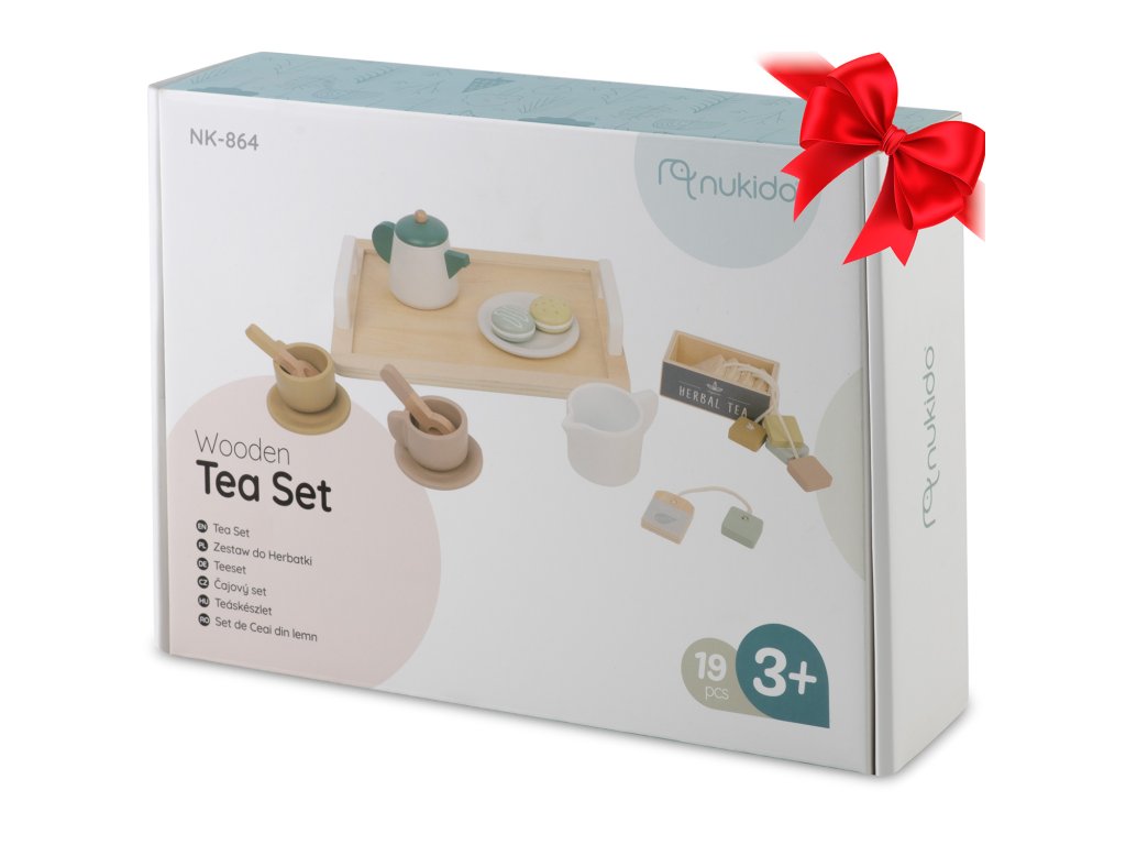 V setu se nahajajo visoko kakovostni leseni elementi, kot so čajnik, skodelice, žličke ali pladenj za serviranje. Nanj lahko postavite tudi makrone, in v skodelice vstavite priložene čajne vrečke, kar dodaja celotni sceni avtentičnost in omogoča otroku organizirati elegantne zabave.