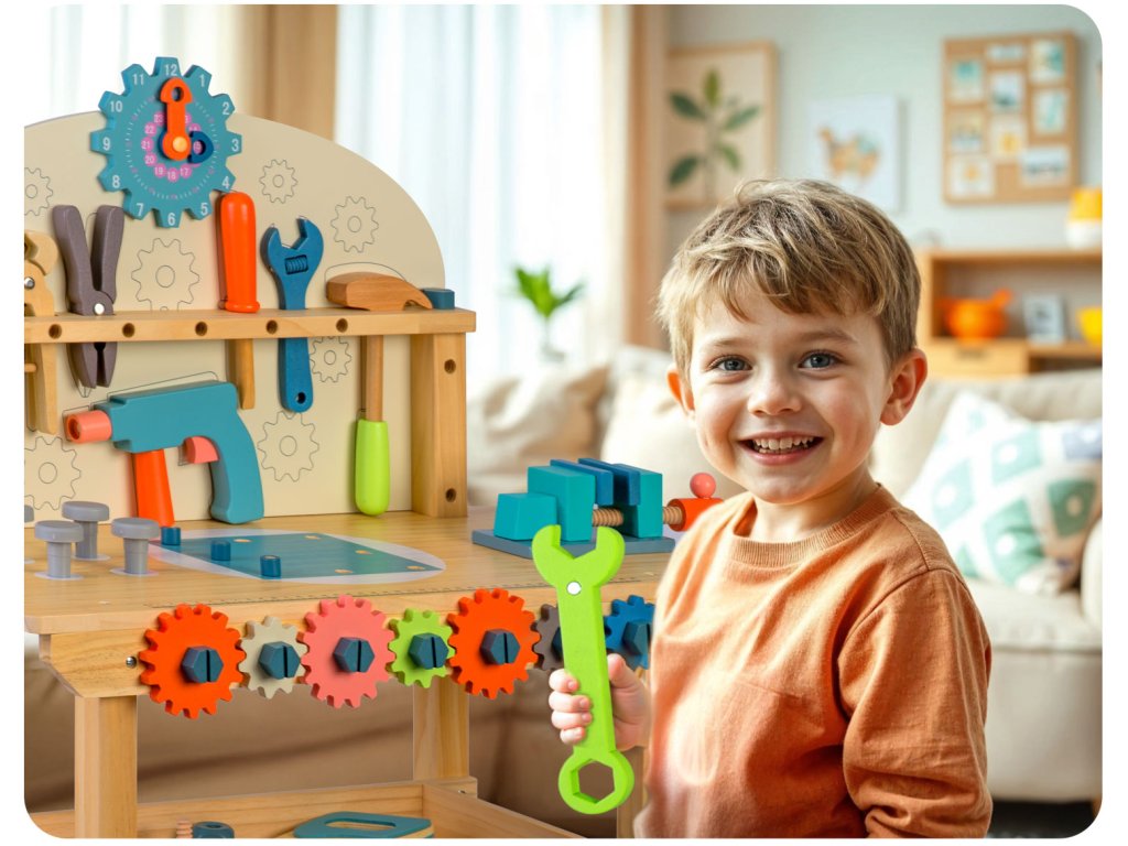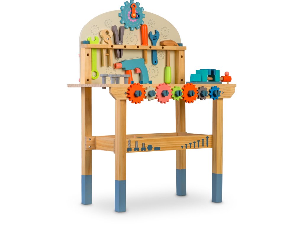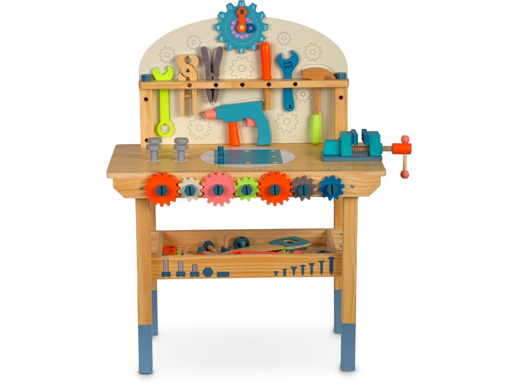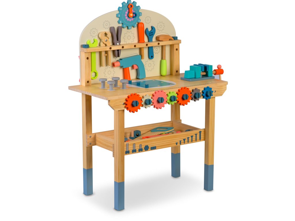 Predstavljamo delovno mizo za otroke, opremljeno s policami in orodji, ki spominjajo na prava, le da so narejena iz plastike, lahke za vzdrževanje.