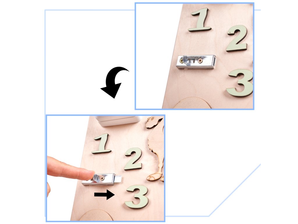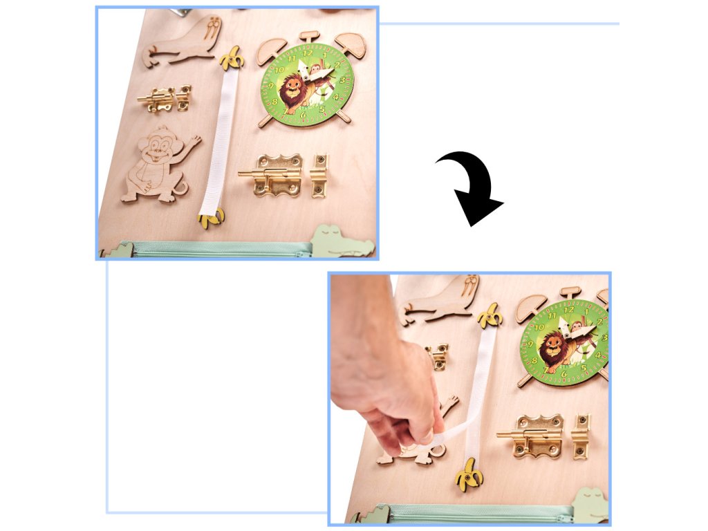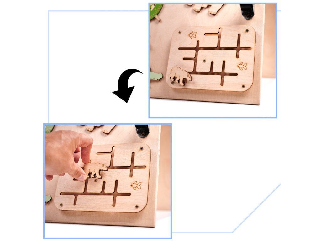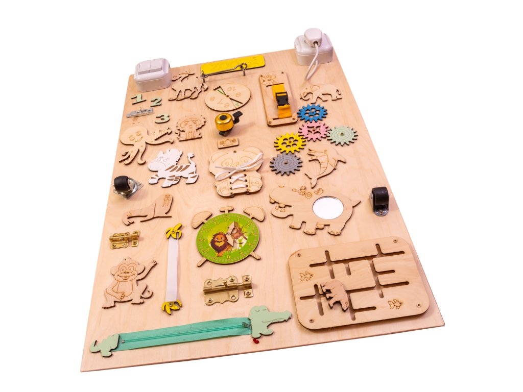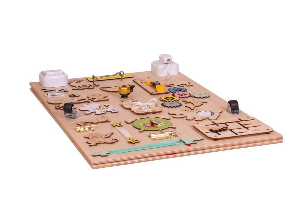 Manipulativna tabla, znana tudi kot senzorična ali motorična tabla, je pravokotnik, v tem primeru lesen, na katerem so nameščeni različni elementi. Njihov namen je spodbujati razvoj malčka ter mu nuditi veliko fantastične zabave!