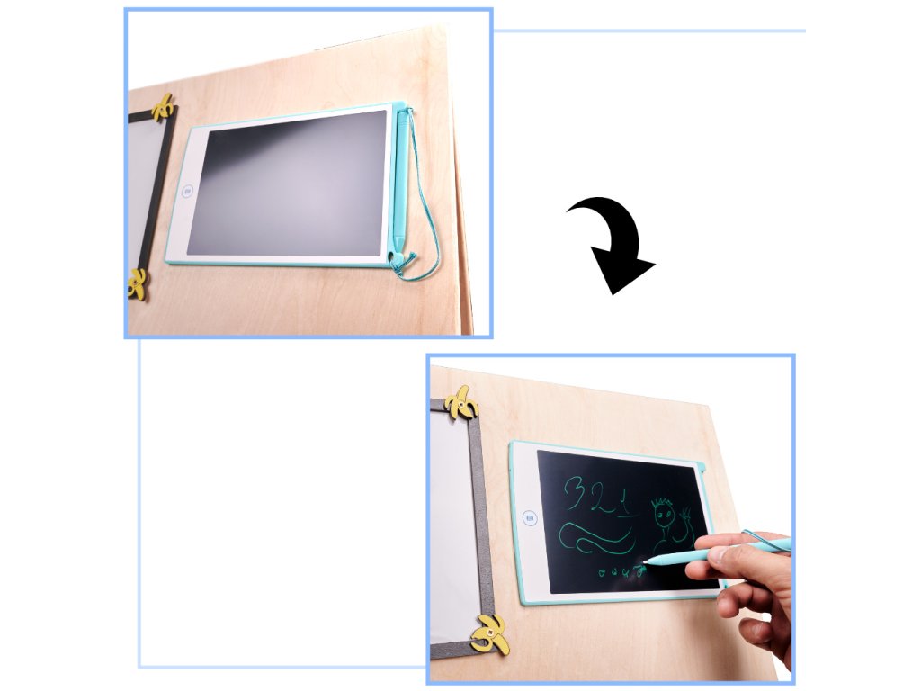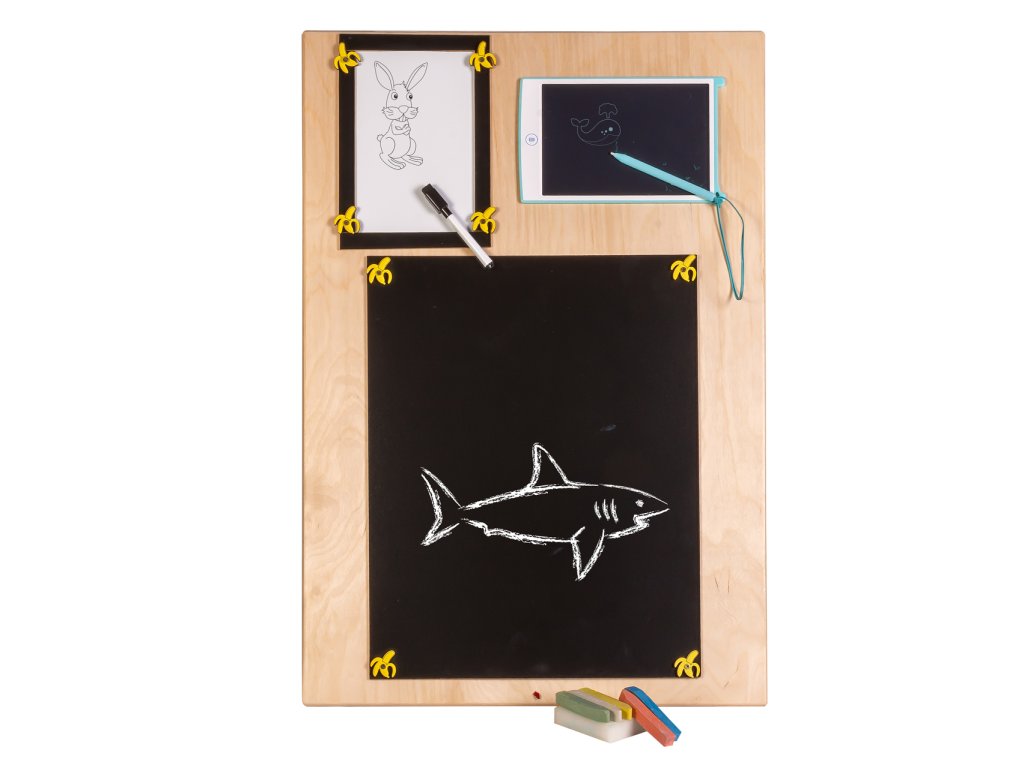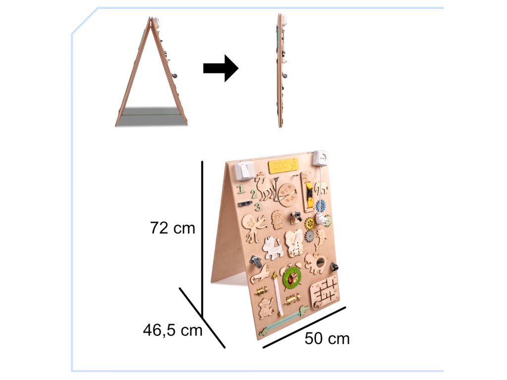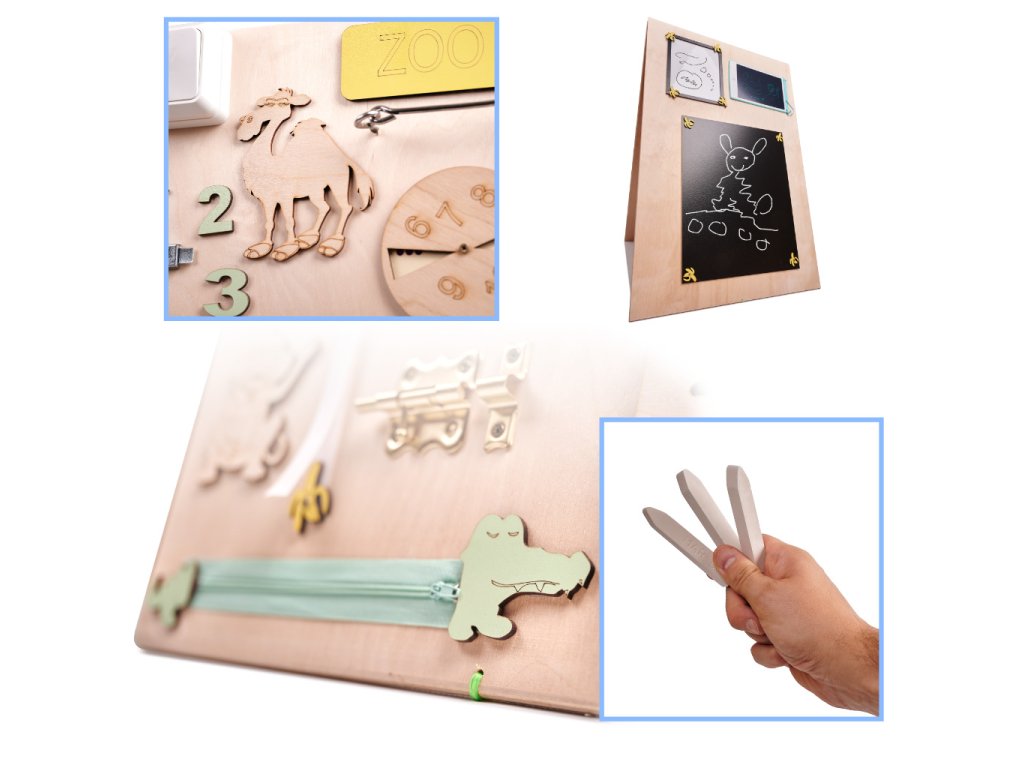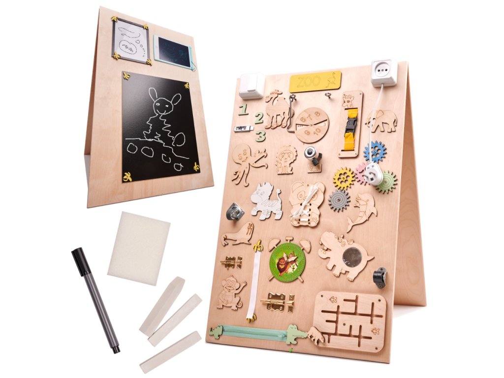 Ta tabla je nekoliko drugačna, ker je dvojstranska! Na eni strani je tipična manipulativna tabla z množico mehanizmov, drugo stran pa sestavljajo tri table, na katere se lahko piše s kredo, piši-briši flomastri in pisalom!