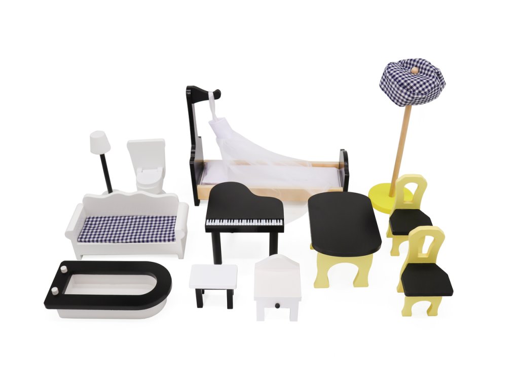 Set vključuje čudovito leseno pohištvo, ki bo odlično dopolnilo vsako sobo v hiški.