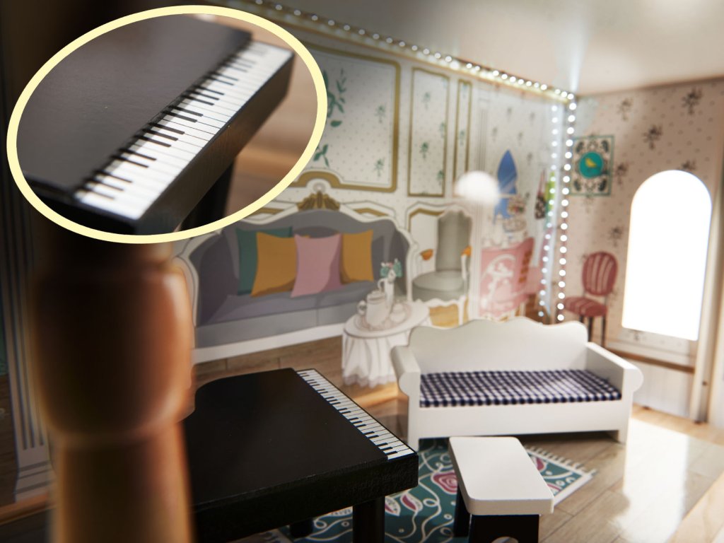 Miniaturno pohištvo, grafika na stenah in LED osvetlitev naredijo igralno hiško edinstveno in zelo prijetno.