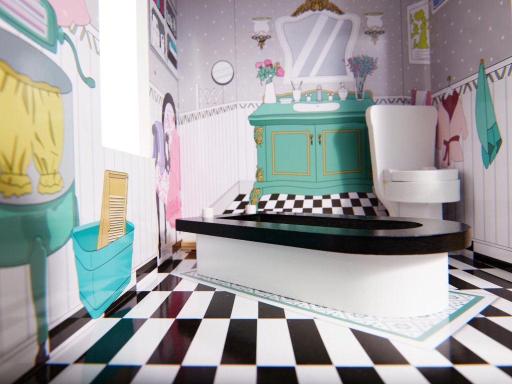 - Pohištvo (postelja z baldahinom, vzmetnico in blazino, nočna omarica, 2x stoli, miza, klavir, svetilka, dežnik, sedežna garnitura, kopalna kad, WC)