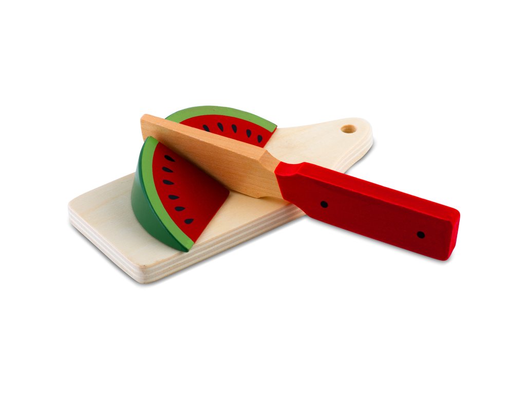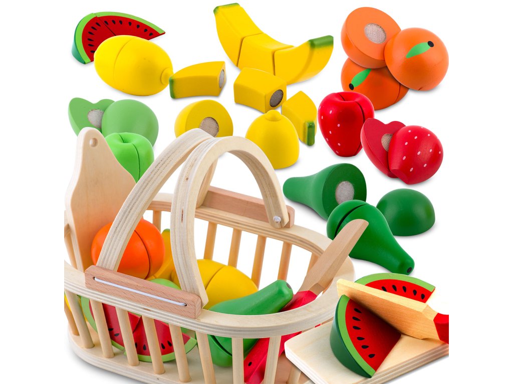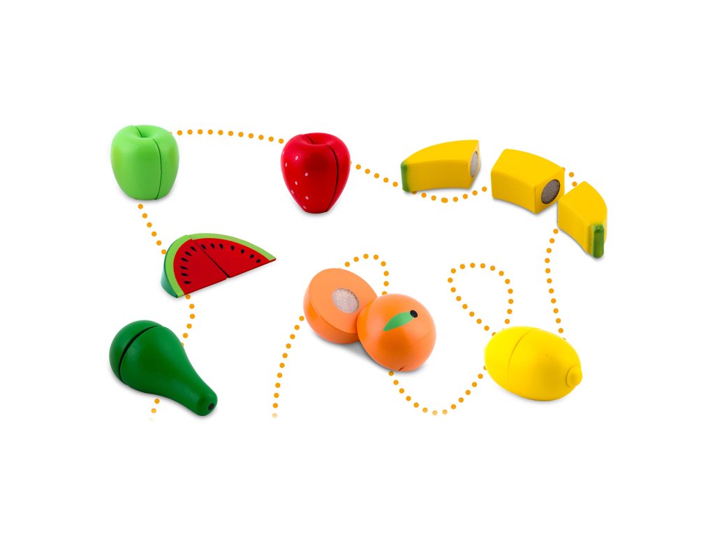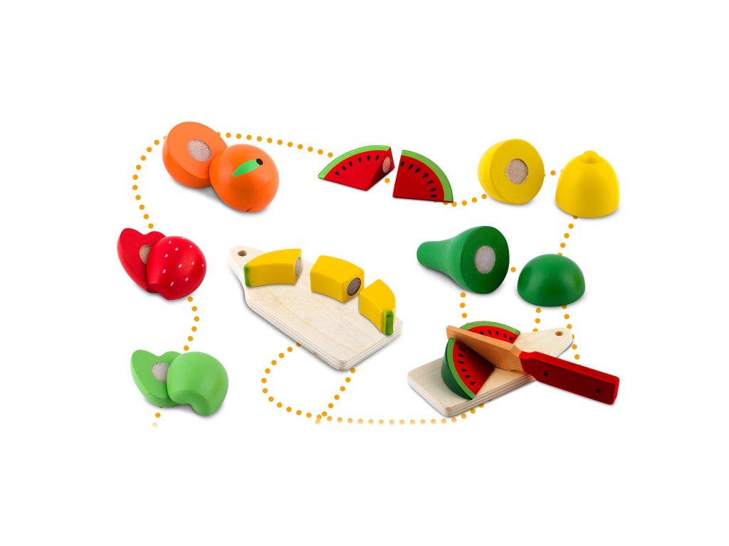 - Komplet je sestavljen iz lesenega sadja, ki ga je mogoče rezati na koščke, kar spodbuja interaktivnost.